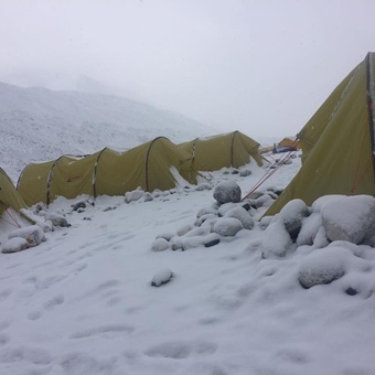 Hello! This is Alex Abramov. We pertly went to the camp at an altitude of 7700 meters. The Weather is perfect. The team is in almost perfect condition. All participants seek for the summit. Tomorrow we go up to the camp at 8300 meters.