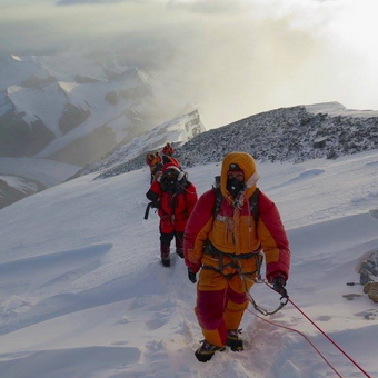 Hello! This is Alexander Abramov from the North Col of Everest. The weather is beautiful, our first team moves up. Today, according to the plan we do clinb to a height of 7600 meters. Tomorrow – on 8300, and the day after tomorrow, on May 20, should be a summit bid. In our first team: Alexander Abramov, Lyudmila Korobeshko, Irena Kharazova, Liana Chabdarova, Oleg Pimenov, Vlad Moroz, Roma Reutov and Vladimir Kotlyar. Eight people. Everyone feels fine. The weather is beautiful, the prospects - excellent! Bye!