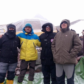 Hello! It is Vladimir Kotlyar from Aconcagua. Our climbing partners have decided to fly home for personal reasons. They flew in a helicopter. And we've got two. Here, unfortunately. But we did not finish the expedition ... Now we sit down in Plaza de Mulas, at an altitude of 4300 and expected weather. We've got sweeps, the blizzard. The wind is very strong at the top. On top along the weather forecast the wind is now 70-75 ... We will be waiting for the weather and go upstairs. Adios! All the best!