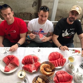 I met hare a lot of friends. Basically they are guides my age ) and younger. Of course, Visily Pivtsov is in the middle of it. Our team went to the sauna. We have a very good guide named Andrey. The team are friendly. Tents for accommodation are excellent. You can stand in growth. Everything is fine. Tomorrow we will go on Petrovskogo peak.
