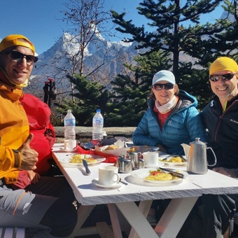 A group of "Athletes moonshiners" spent an acclimatization day in Namche. We had Breakfast at the "Everest view" hotel with views of snow-capped peaks. Then we went to the village Khumjung, visited the monastery with the Yeti scalp and the Hillary school.