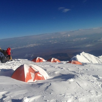 Down we ran almost happily. In camp 2 it was very warm and we stayed there for almost an hour, basking in the sun. This camp offers a great view on the top, I looked up to see around the ridge huge flags - the wind raged there until now, it was clear that to come in that day to the summit would be impossible, would there blew us away like dry leaves from the tin roof. By 3 pm we were down to camp 1, the descent took place without incident, though it was slow and tiring. By 5 pm again it threw the snow, but here, in a huge tent, its knock on the tent even gave some sense of comfort…