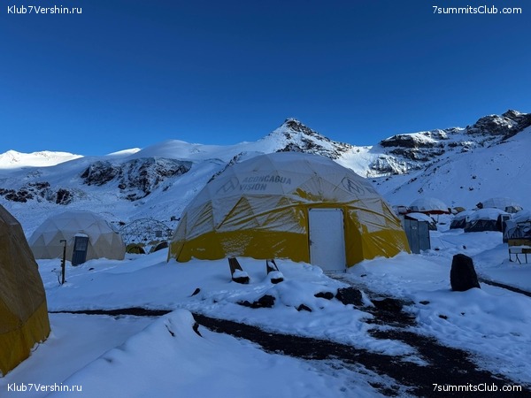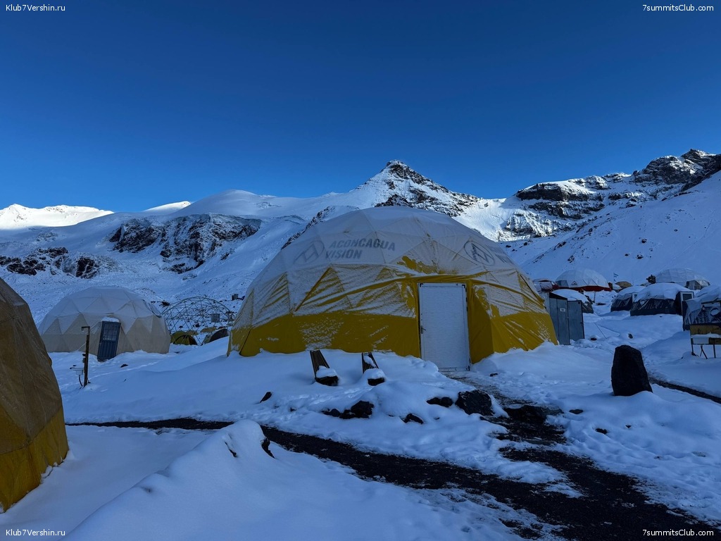 Greetings from Aconcagua Base Camp! Today, the "Incas on the Trail" group reached Plaza de Mulas. It was a challenging hike: 18 kilometers long and a kilometer vertical. The entire group reached the camp in eight hours, just before the bad weather set in. We settled into comfortable "domos", dome-shaped tents. Afterward, we had a wonderful dinner, and everyone went to rest after a hard day. Tomorrow is a rest day; we'll get ourselves together and relax. With you were 7 Summits Club guides Sergey Avtomonov and Leuan Atabiyev.