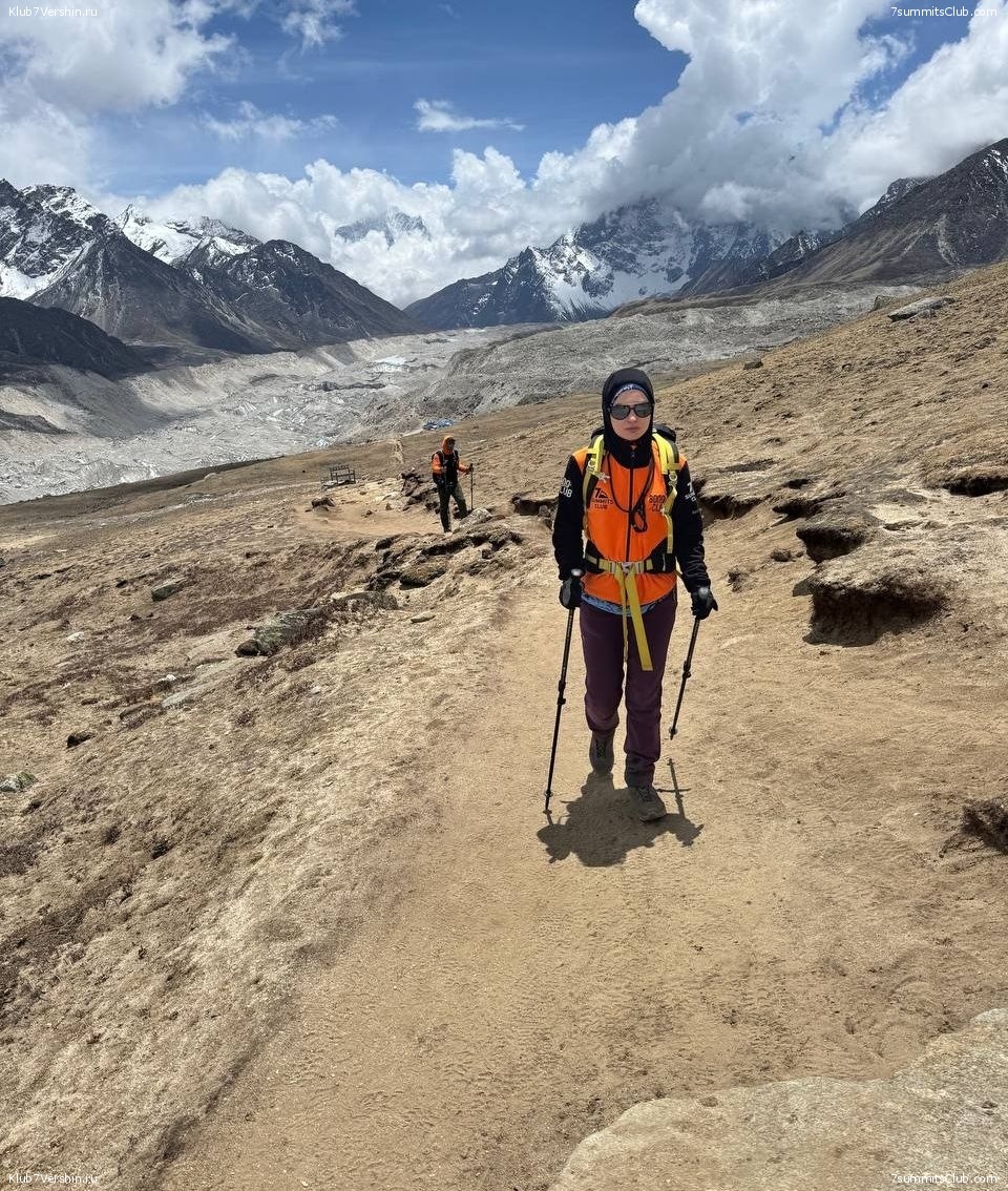 News from "Abramov's Favorite Group". Today we had a long day. We left early in the morning from Lobuche. The altitude had already let us know, we walked slowly but surely. We reached Gorakshep, where we split up. Some went straight to the base camp, and some to Kalapathar. We climbed Kalapathar and then went to the base camp. In the evening, Abramov himself came to us, he came down from the 3rd camp and then everyone ate very tasty food and celebrated May 9. With you was the guide Sergey Avtomonov.