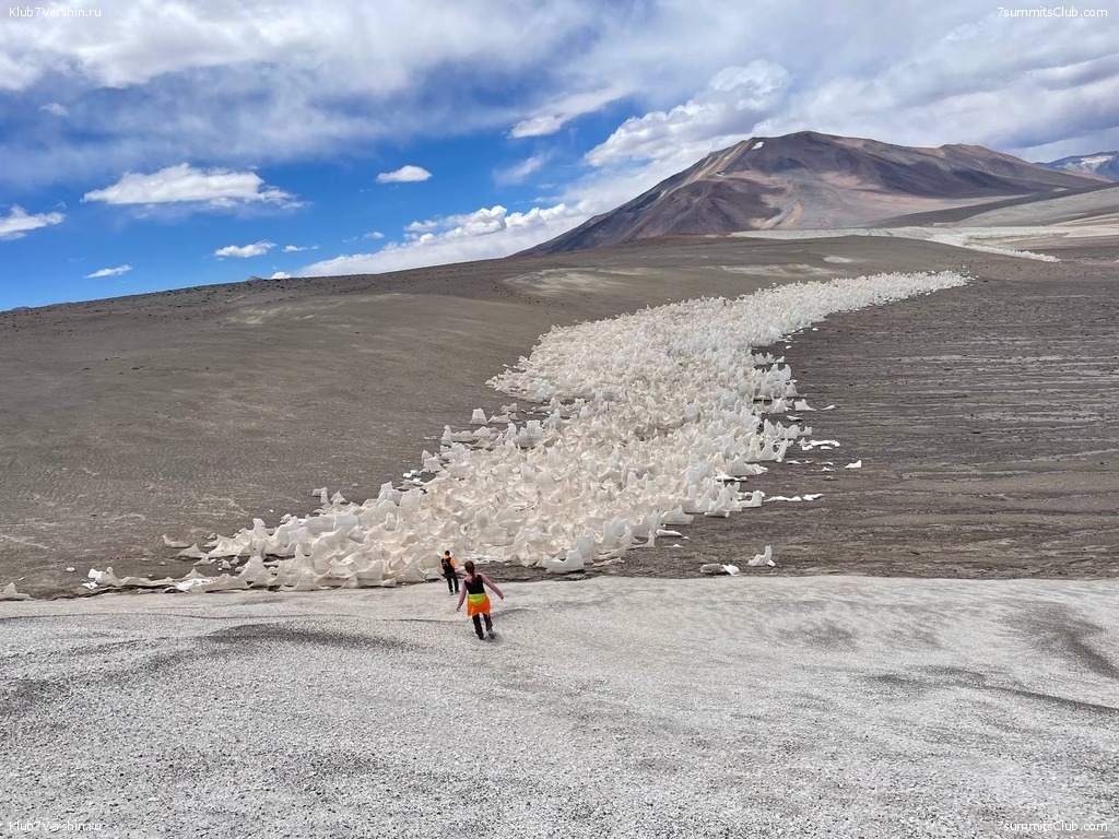 As part of their final acclimatization rotation, the 7 Summits Club group climbed to the Tejos refuge by car. After hiking further up the slope, the participants and guides spent the night at 6,000 meters and descended to the Laguna Verde camp.