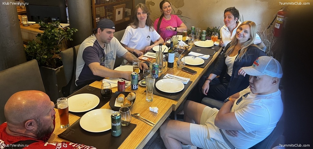 Greetings from sunny Argentina! Our new group assembled today. There are six, all ready for the climb and motivated for success. On this warm Argentine evening, we gathered in a cozy restaurant, got to know each other, and ate delicious meat. The group tasted the famous Argentine Malbec wine, and now we're ready for adventure. Group guides Georgy Bushuev and Dmitry Semenov.