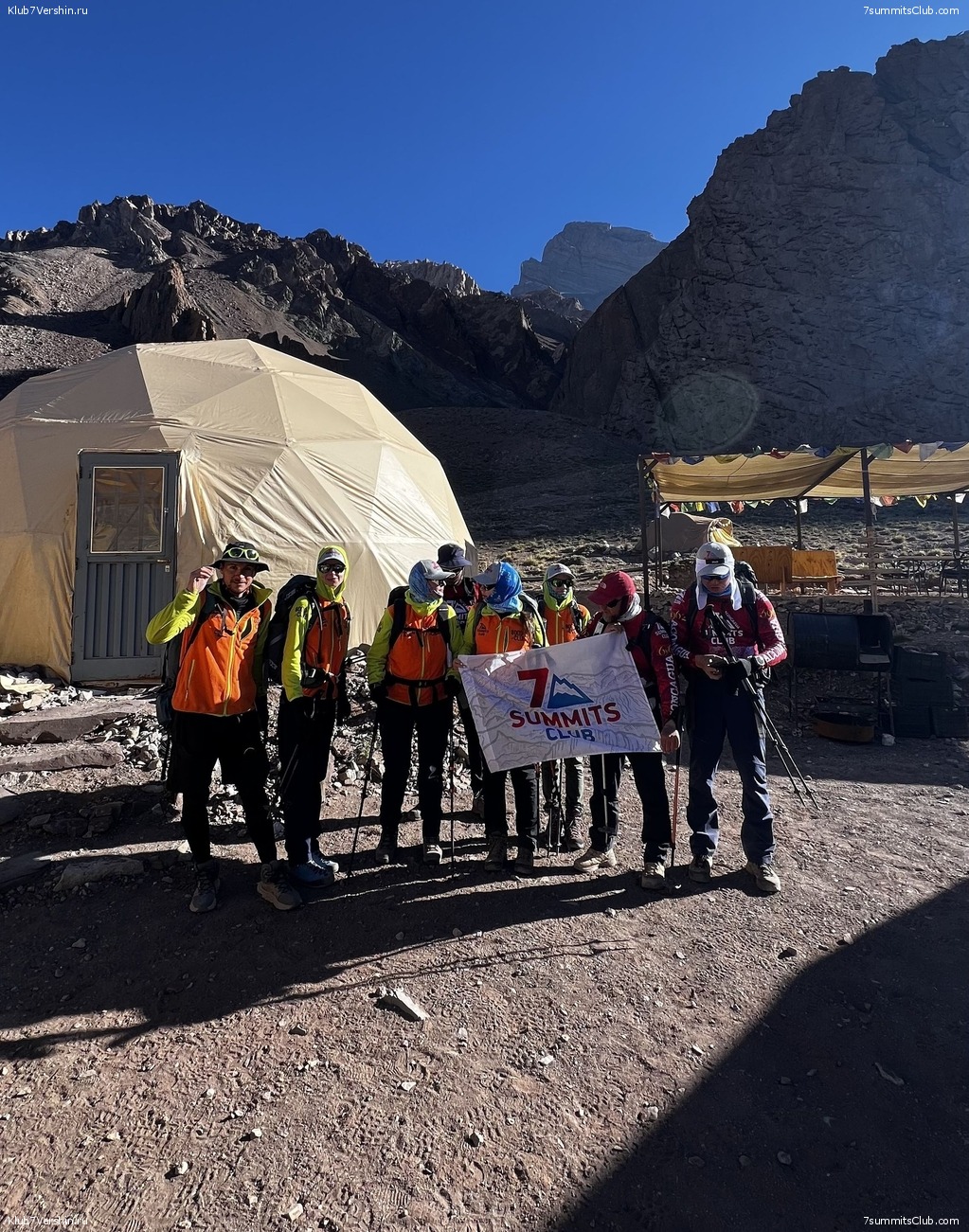 Greetings from the slopes of Aconcagua, from the "Malbec" group! Today we spent a rest day at our camp at 4,300 meters. We walked to the old hotel, even got a chance to go inside, and saw the 7 Summits Club flag, apparently left by some of our first climbers on Aconcagua. It was a true touch of history. We also visited the highest art gallery in the world, which is listed in the Guinness Book of World Records, and admired the works of artist Miguel. Tomorrow begins our altitude acclimatization, reaching 5,000 meters. The group is in great spirits. Guides: Georgy Bushuev and Dmitry Semenov.