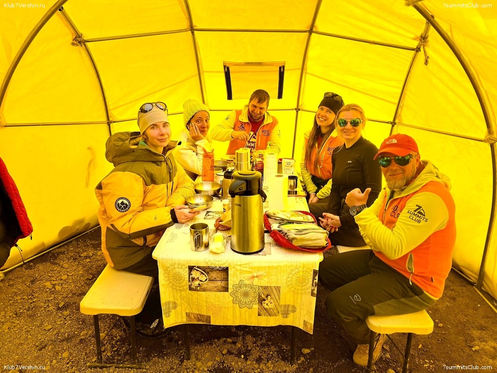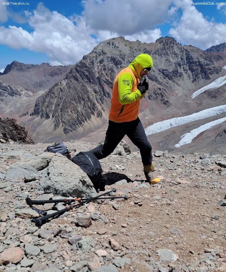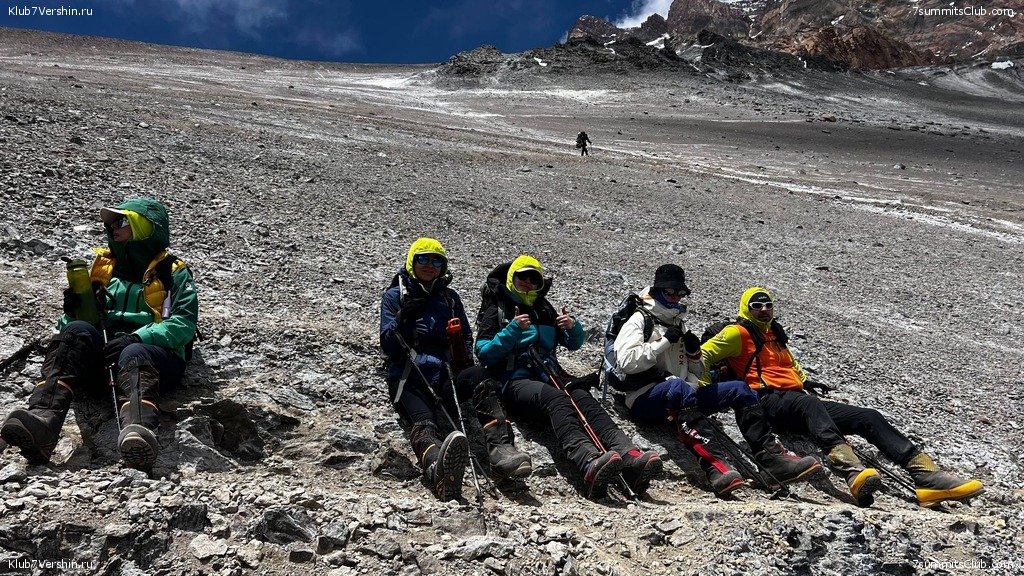 Greetings from the slopes of Aconcagua! Today, our "Malbec" group ascended to the Nido de Condores camp (5,500 m). The weather was fine during the ascent, and we climbed quite quickly. At the camp, as always, thanks to Valera Myasoedov's care, we had boiling water, so essential at altitude, hot tea, and cookies waiting for us. These are the things that quickly restore our strength. Also during the ascent, we had an interesting encounter with the famous Nepalese climber Nims. We took a photo with him. The group's guides were Georgy Bushuev and Dmitry Semenov.