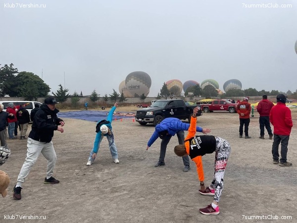 Greetings to everyone from Mexico, where we are beginning the climbing season on Orizaba! Today, the first large group, with the very Mexican name "Axolotl," began their journey to the summit of North America's highest volcano. We began our journey by exploring Mexico's most famous pyramids—the Pyramids of the Sun and the Moon in the ancient city of Teotihuacan. Or rather, we tried to begin with a hot air balloon ride over the pyramids. But, alas. There was fog all morning, so the flights were canceled. And those balloonists who did manage to take off saw nothing but fog. We weren't too upset; we did some exercises with the hot air balloons as a backdrop, and then went for a walk around the pyramids and listened to amazing stories. Later in the evening we moved to the La Malinche volcano, which we will visit tomorrow for acclimatization.