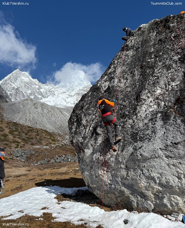 For now, we're resting and eating well. Today, we also went for an extra workout on a rock near the camp. We practiced different ascent and descent techniques.