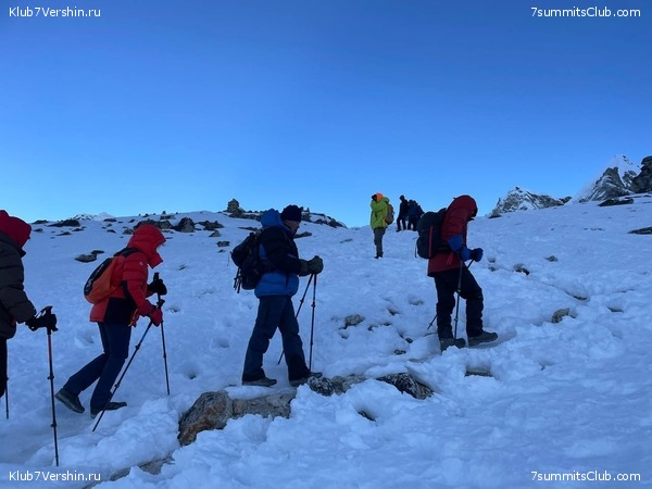Prolonged bad weather in the Nepalese mountains prevented climbers from ascents, and our "Experienced Yaks" group opted to descend for a while. This morning, the team returned, flew by helicopter to Ama Dablam Base Camp. We had a quick lunch and immediately set out for Camp 1. There's a good weather window ahead! There's a lot of snow and a lot of people, but we'll keep trying! Wish us luck on our second attempt!