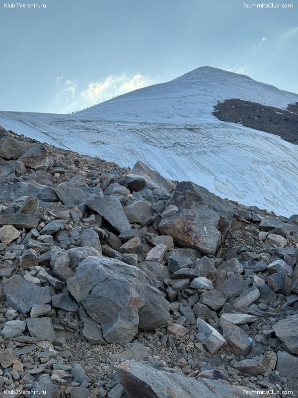 Good evening! Mount Ararat continues to test our team for strength of spirit and endurance. We successfully went from the base camp (3200) to the assault camp (4200) for acclimatization, overcoming the dusty and rocky slope of the mountain. There we were pleasantly surprised to meet the "Super Girls" team descending after a successful ascent. We managed to take a memorable photo against the backdrop of Ararat with the legendary Alexander Abramov.