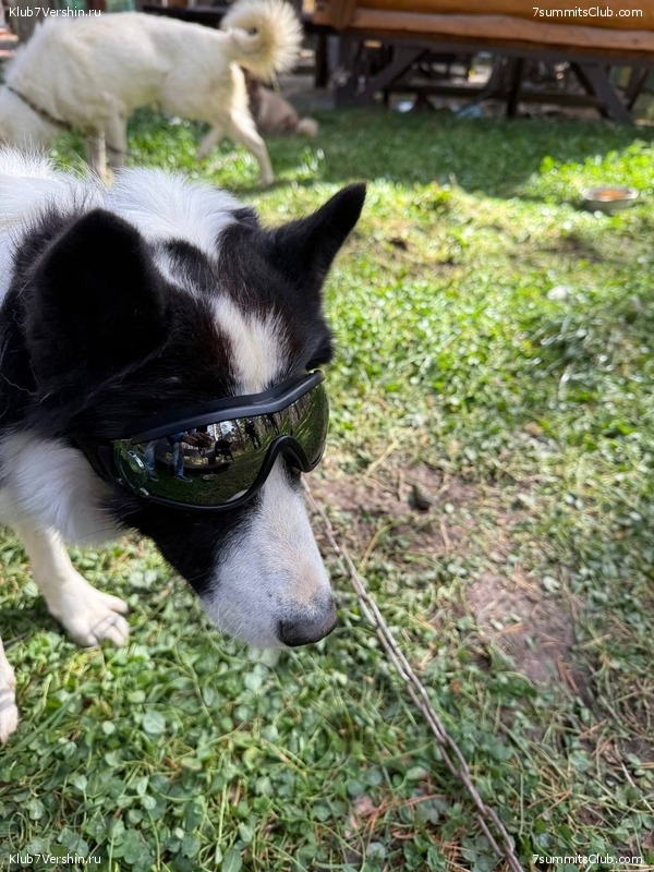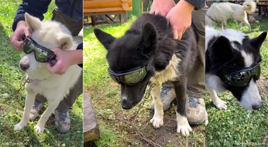 The first day of acclimatization for Sherpa dogs in the Elbrus region. Getting them used to sunglasses