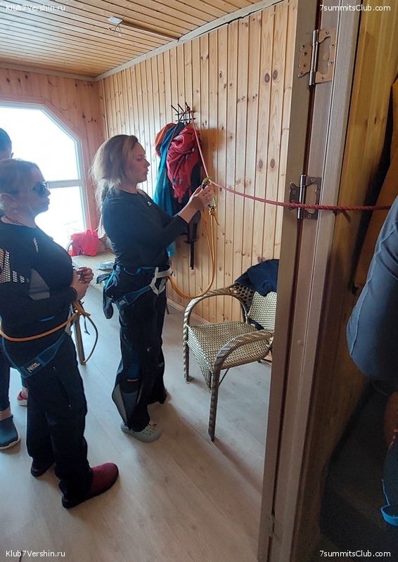 Good day to all! Our last VIPs of the Elbrus program, called "high-altitude climbers", rushed to the "Ai" cafe in 1:30. We got wet in the rain, drank tea, and ran down. After lunch, we got dressed at the rental, and at the hotel we had classes on adjusting crampons and systems. And we also found time to walk between the pines, practice fixed ropes climbing. Everyone is cheerful and happy!