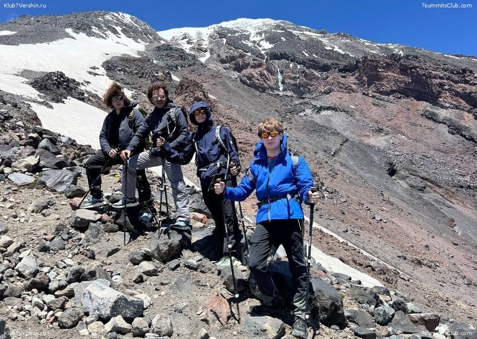 Good evening! Mount Ararat continues to test our team for strength of spirit and endurance. We successfully went from the base camp (3200) to the assault camp (4200) for acclimatization, overcoming the dusty and rocky slope of the mountain. There we were pleasantly surprised to meet the "Super Girls" team descending after a successful ascent. We managed to take a memorable photo against the backdrop of Ararat with the legendary Alexander Abramov.