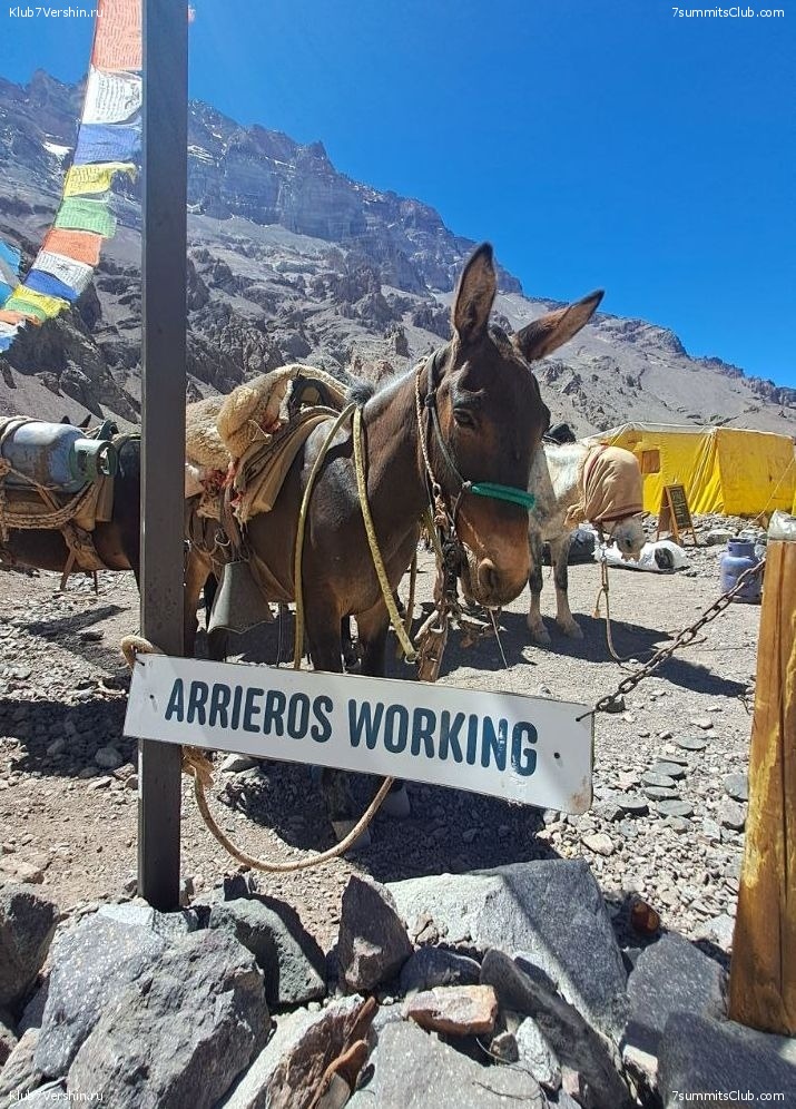 Greetings from the slopes of Aconcagua! Today we spent the day at our base camp. We visited the highest art gallery, where we saw the works of our artist friend, Miguel. Tomorrow we set off for our high-altitude camp, Nido de Condores. Today, mules also brought us the gear for our next group, who will be here in two days. Group guides Georgy Bushuev and Dmitry Semenov.