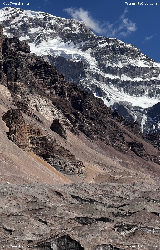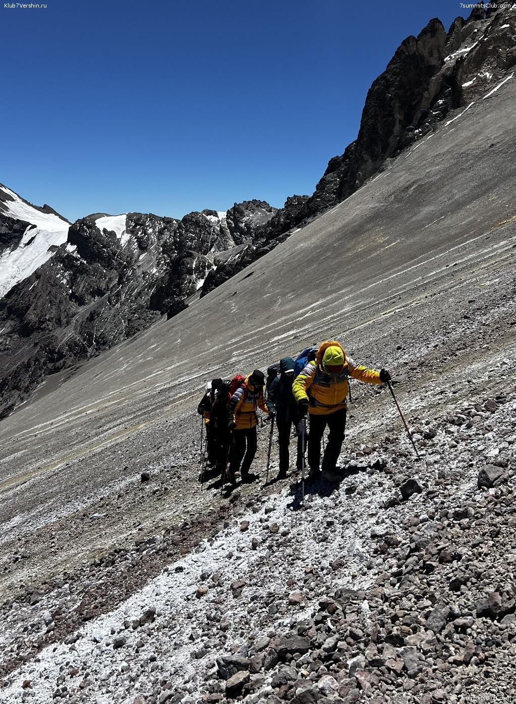 Greetings from the slopes of Aconcagua! Today, our supergroup ascended to our high-altitude camp, Nido de Condores (5,500 m). Now it's time to rest and then onward to our goal, the summit of Aconcagua. Group guides: Georgy Bushuev and Dmitry Semenov.