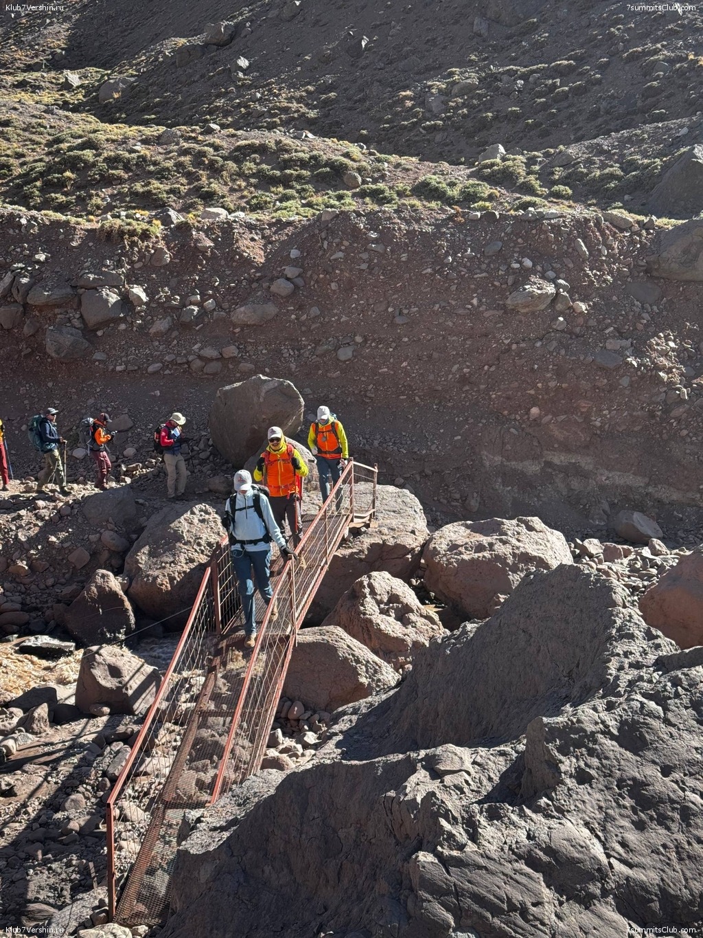 The 7 Summits Club group moved to the start of the Aconcagua ascent route and posed against the backdrop of the famous Inca Bridge