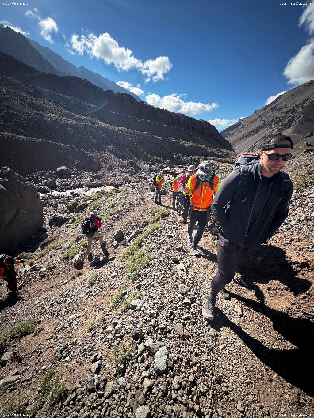 Greetings from sunny Argentina! Today, our super group trekked from the entrance to Aconcagua National Park, where we checked our permits, to Confluencia Camp (3,300m). We completed this stage at a good pace in 2 hours 40 minutes, and the group is in excellent condition. Group guides were Dmitry Semenov and Georgy Bushuev.