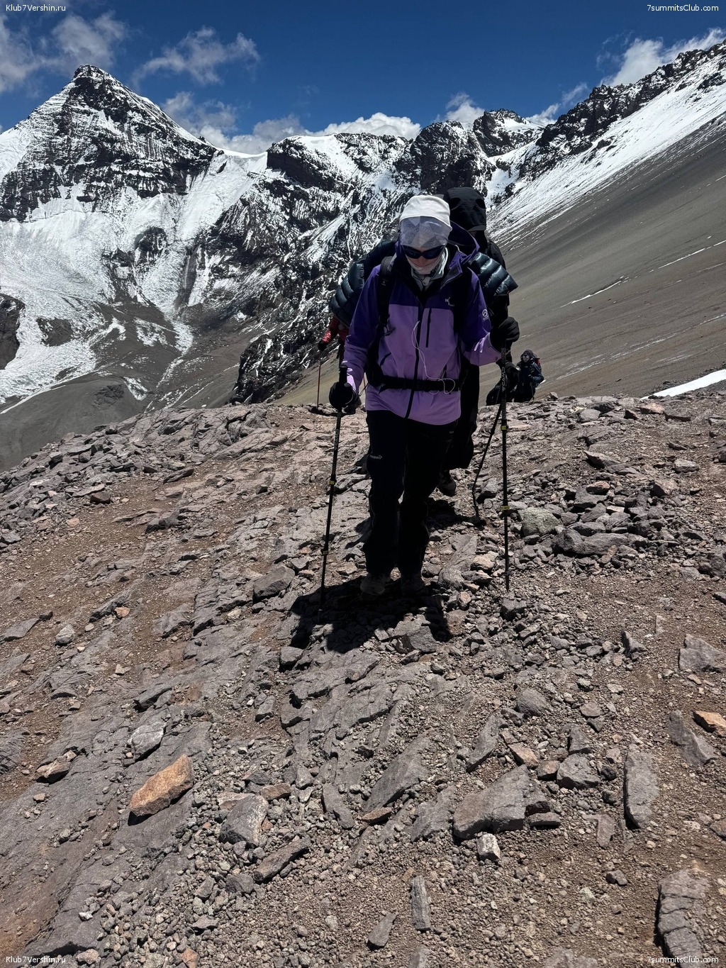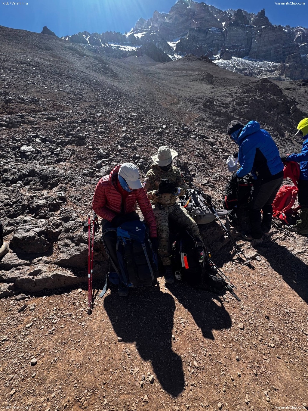 This is the "Incas on the Trail" group. Today, we finally waited for the weather to clear and reached the Nido de Condores camp. After acclimatizing, we moved faster, despite the wind. We reached the summit faster than last time. We had a delicious dinner in the evening. Then we went to watch the sunset. Tomorrow morning, we leave for Camp Berlin. With you were 7 Summits Club guides Leuan Atabiev, Sergey Avtomonov, and Valery Myasoedov.