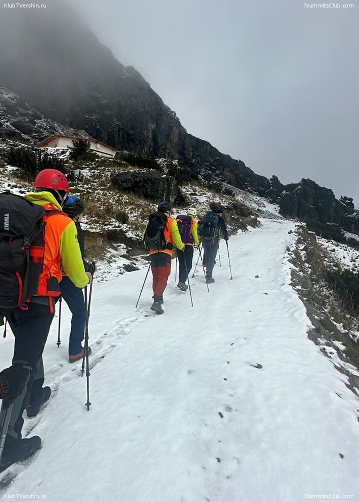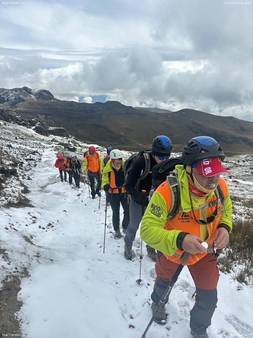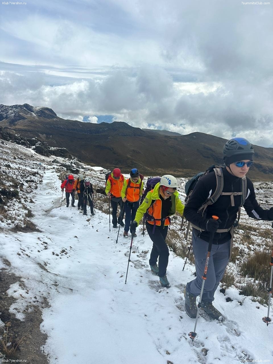 December 6th. Greetings from Ecuador from the "Near zero" group! Today we climbed the first volcano on our program, Guagua Pichincha, at 4,800 meters. On the way up, we encountered Andean wolves (a mountain fox) and caracara birds. We climbed through snow, which is rare here, and barely found the summit in the fog. On the descent, we drank tea made from local Ecuadorian coca (sunfo) at the hut – it immediately invigorated us.