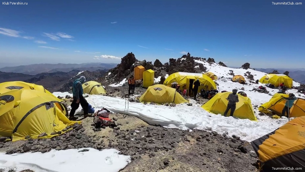 This is the "Incas on the Trail" group. Today, we finally waited for the weather to clear and reached the Nido de Condores camp. After acclimatizing, we moved faster, despite the wind. We reached the summit faster than last time. We had a delicious dinner in the evening. Then we went to watch the sunset. Tomorrow morning, we leave for Camp Berlin. With you were 7 Summits Club guides Leuan Atabiev, Sergey Avtomonov, and Valery Myasoedov.