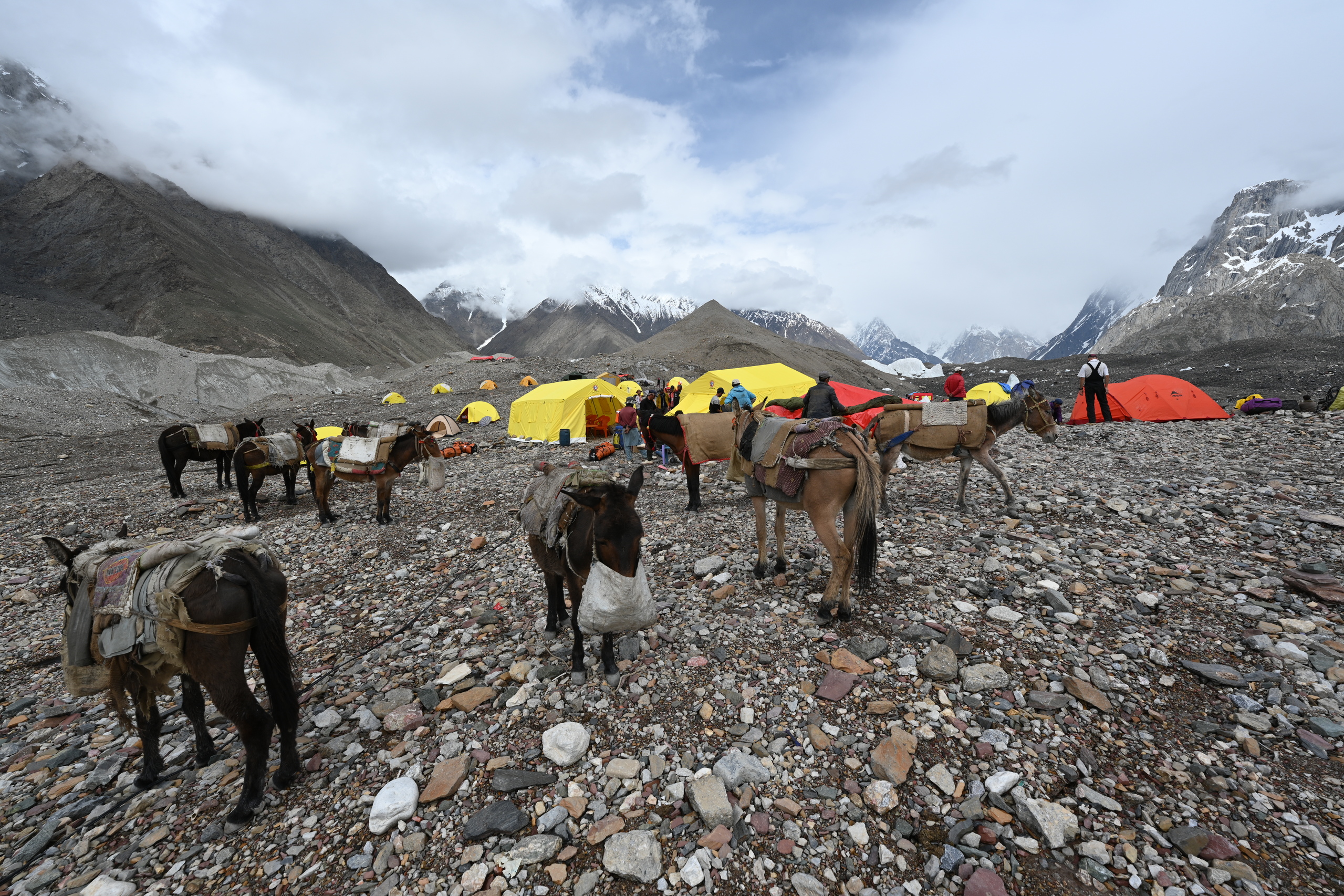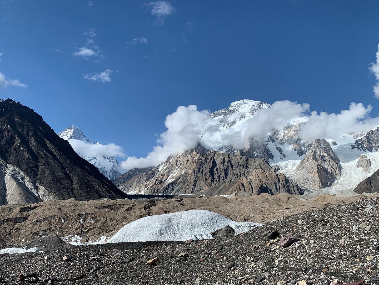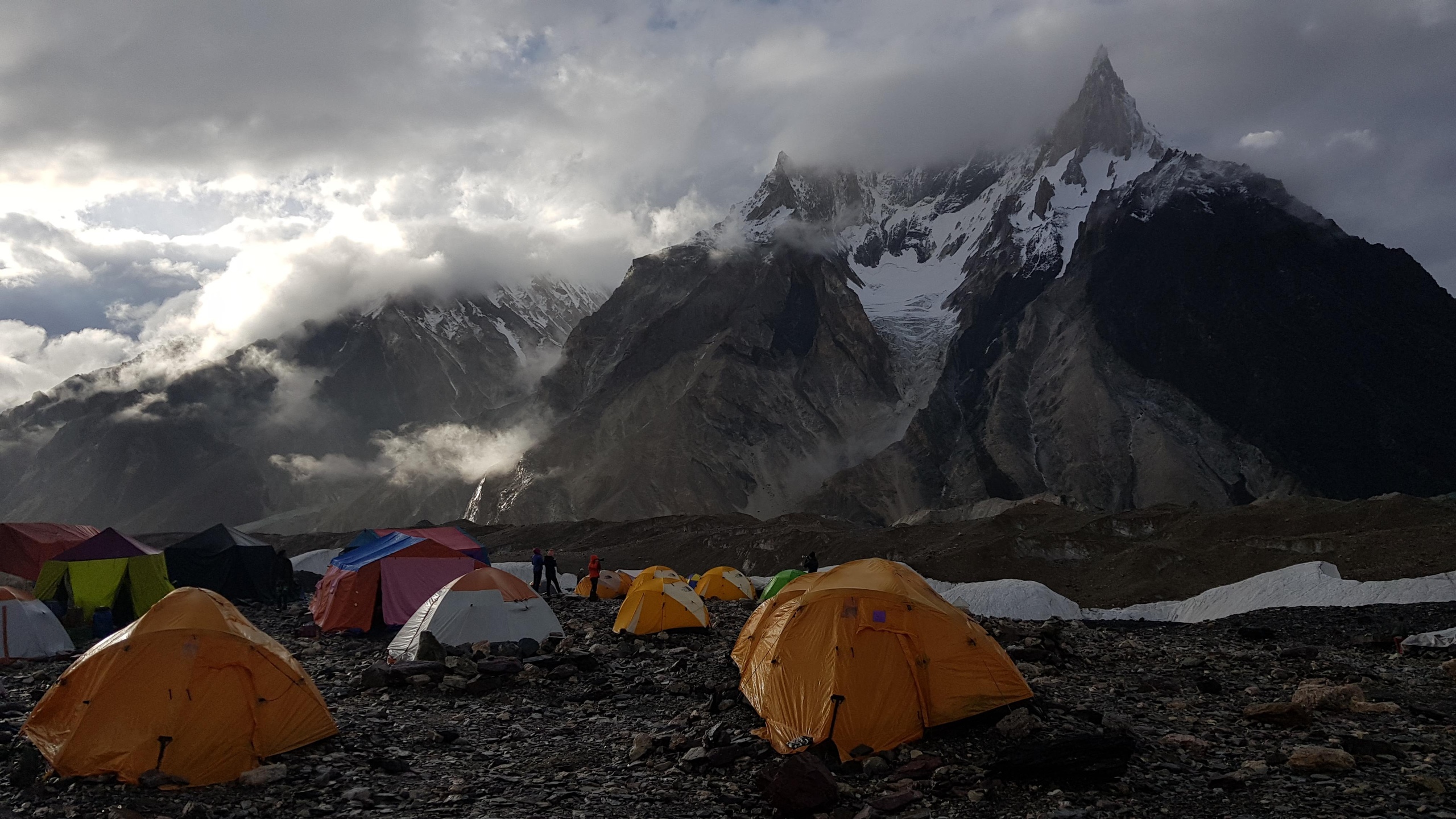 It was snowing and raining all night at Camp Concordia. We also went out in the snow. On the road alternately - then snow, then rain, then a little sun. On the approaches to the BC, the majestic K2 finally emerged from the clouds. However, not for long. But it impressed us very much.