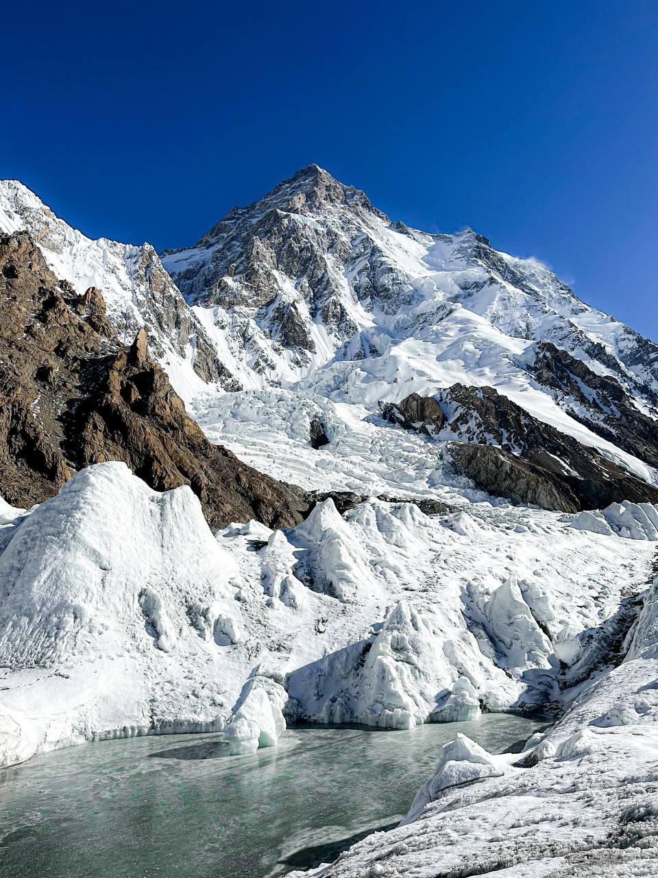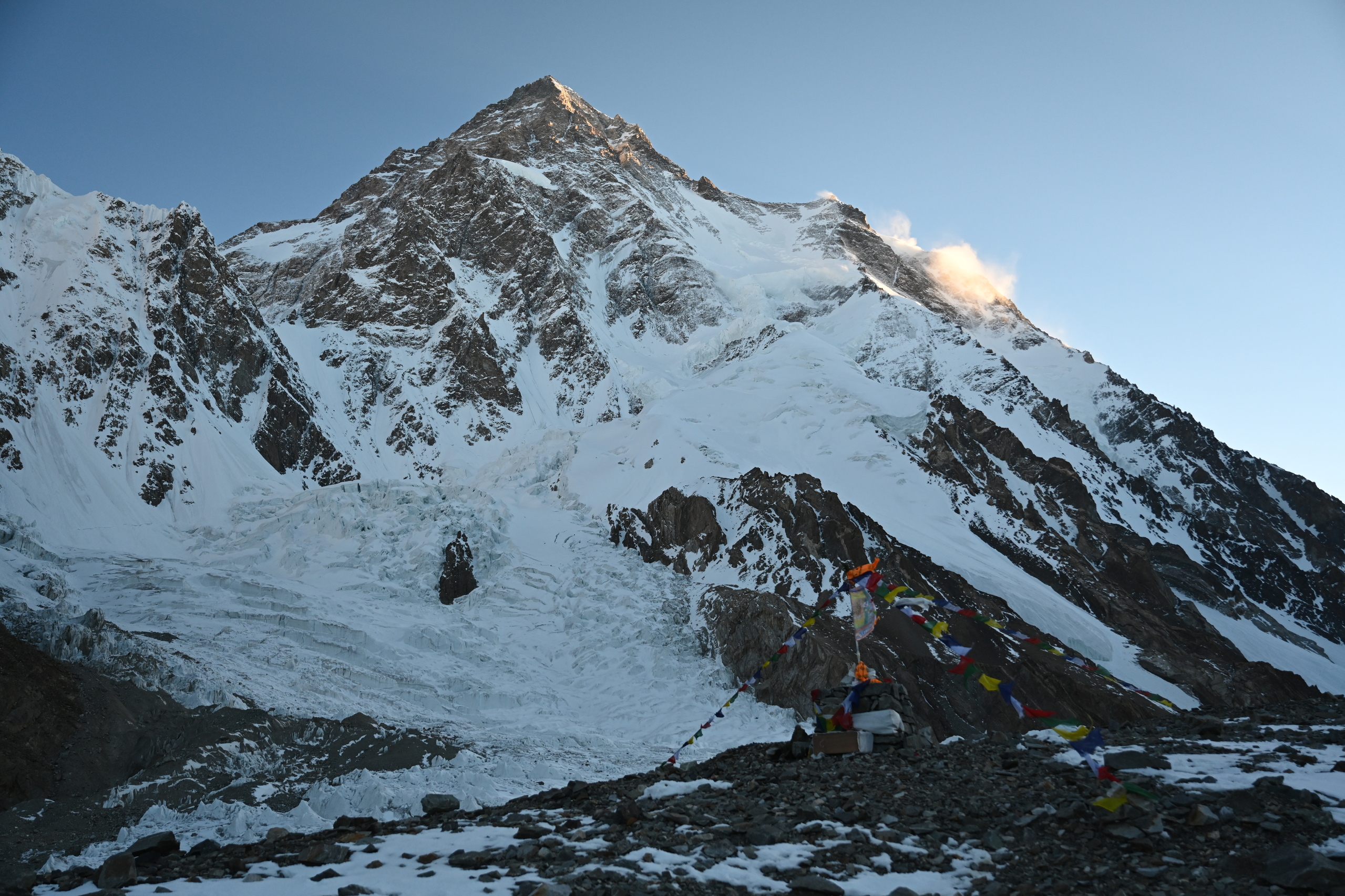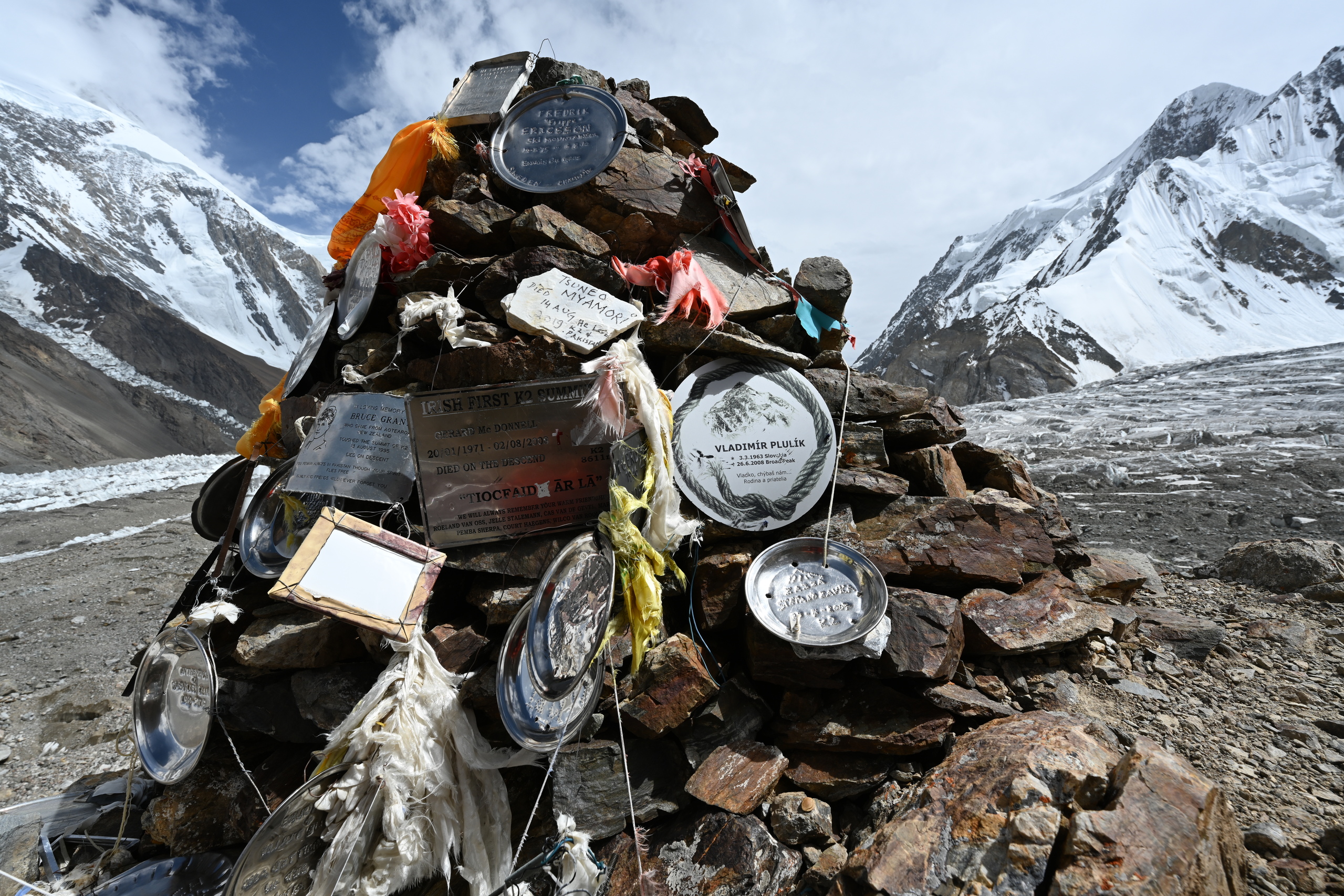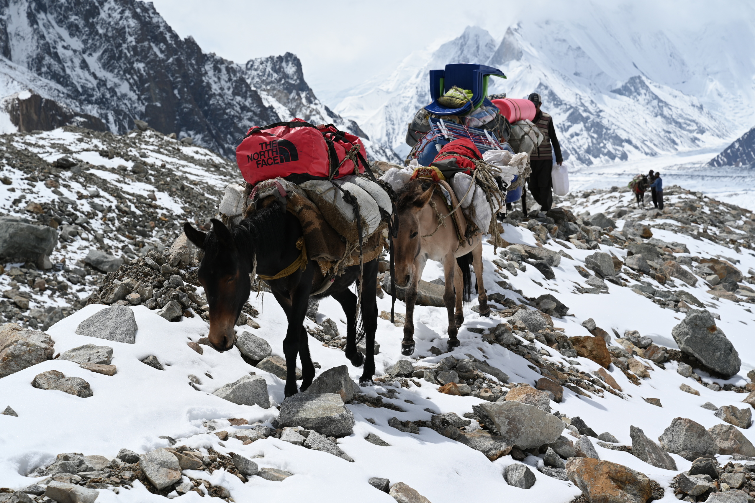 It was snowing and raining all night at Camp Concordia. We also went out in the snow. On the road alternately - then snow, then rain, then a little sun. On the approaches to the BC, the majestic K2 finally emerged from the clouds. However, not for long. But it impressed us very much.