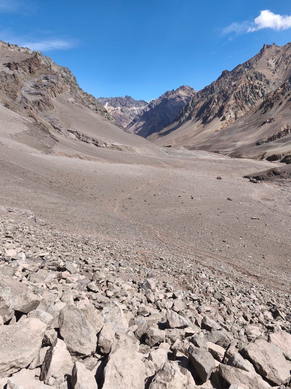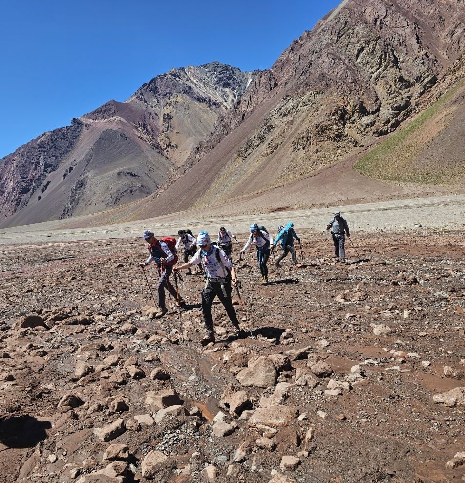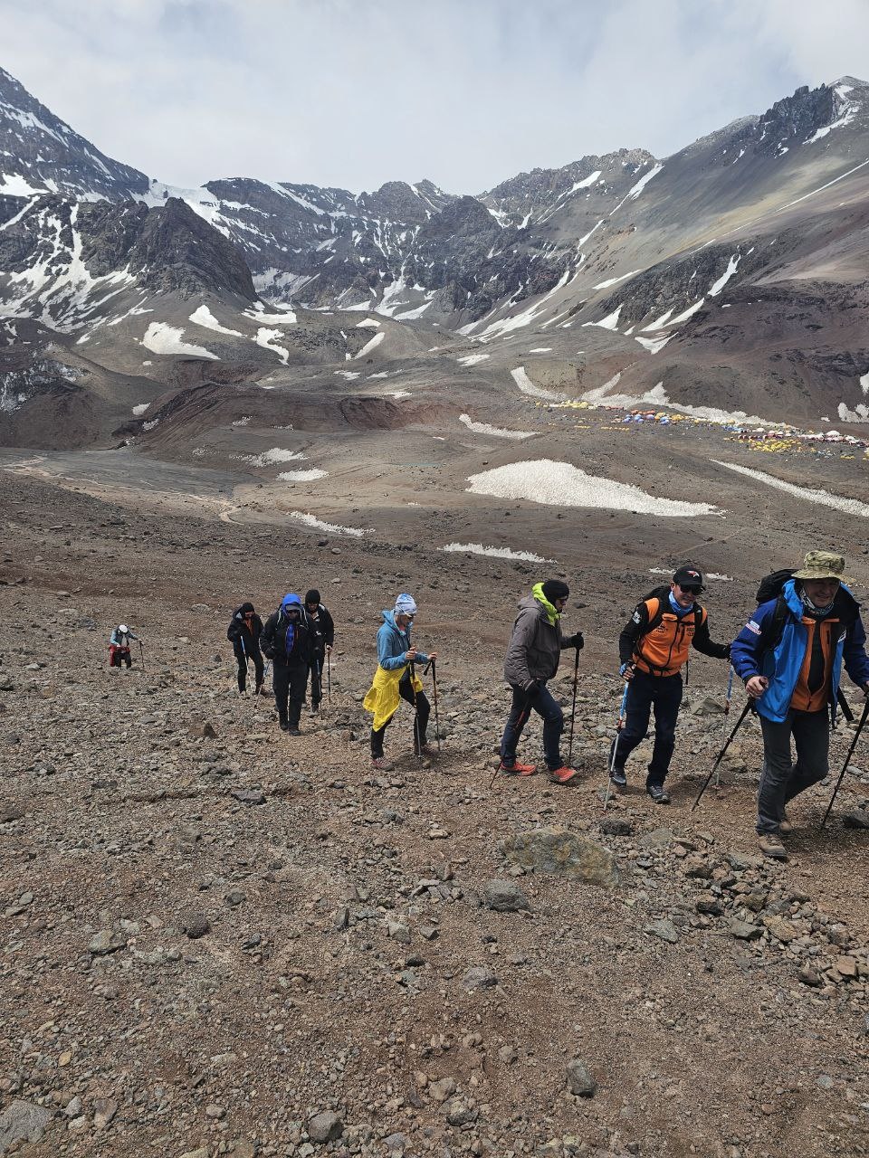 Hola! The "Los Hombres" group made a long trek from Confluencia camp to Aconcagua base camp - Plaza de Mulas. We covered 18 km with a 1000 meter elevation gain in 7 hours. These are the dry numbers that hide the strength and endurance of our group. Tomorrow is a rest and a short walk around the area of the base camp.