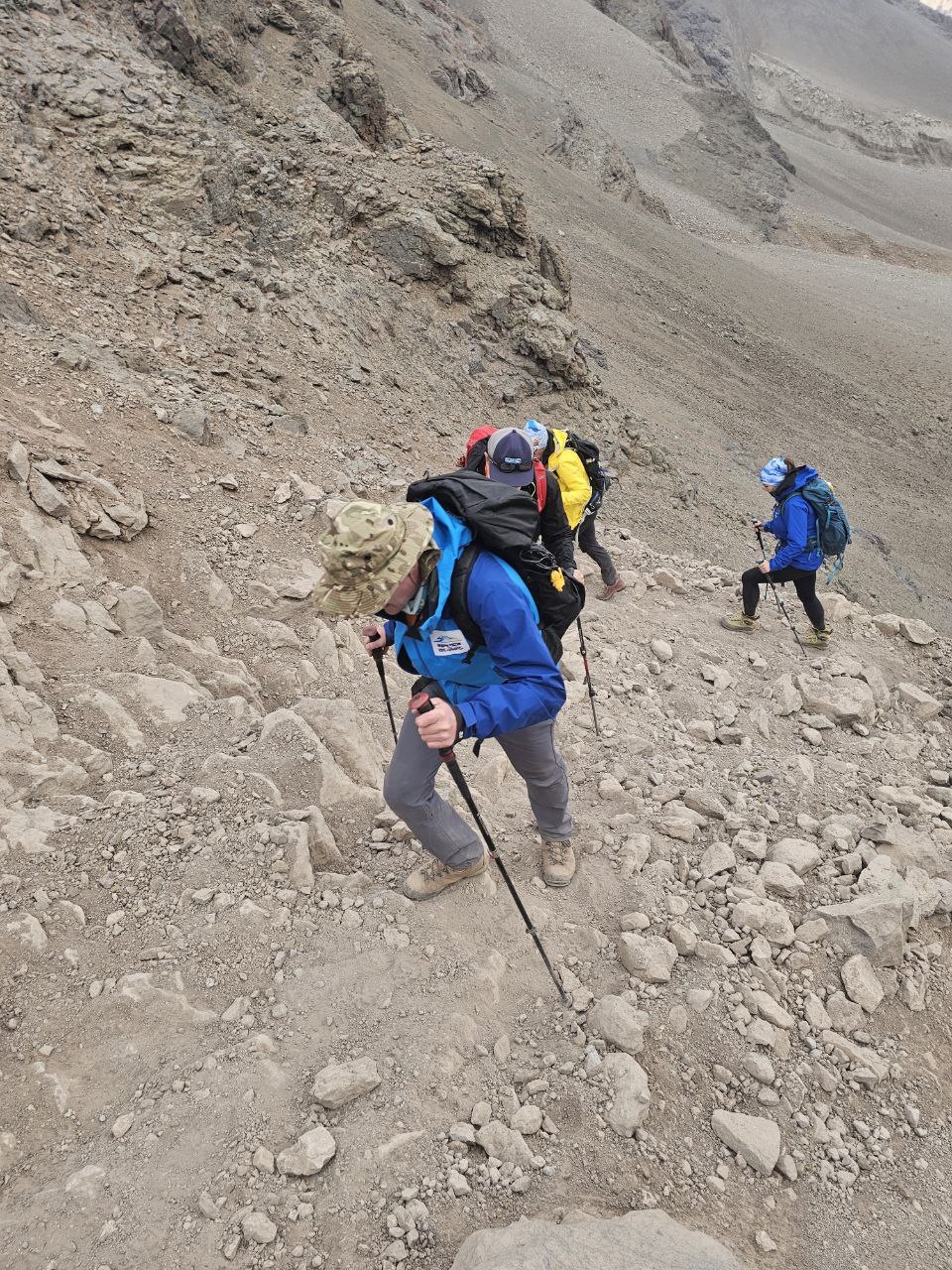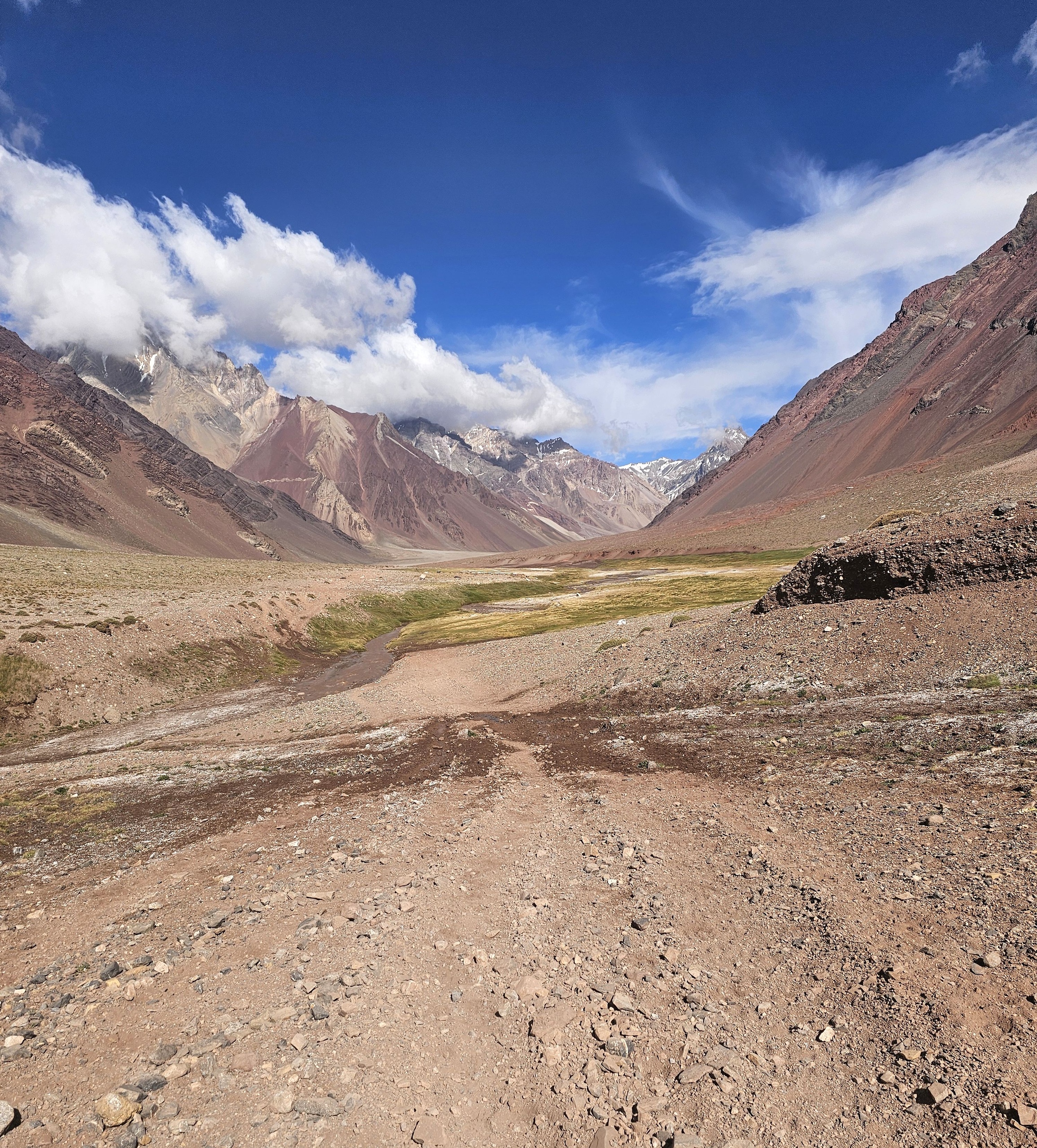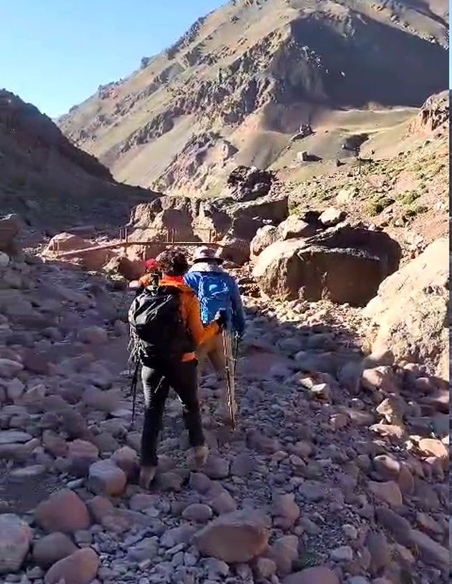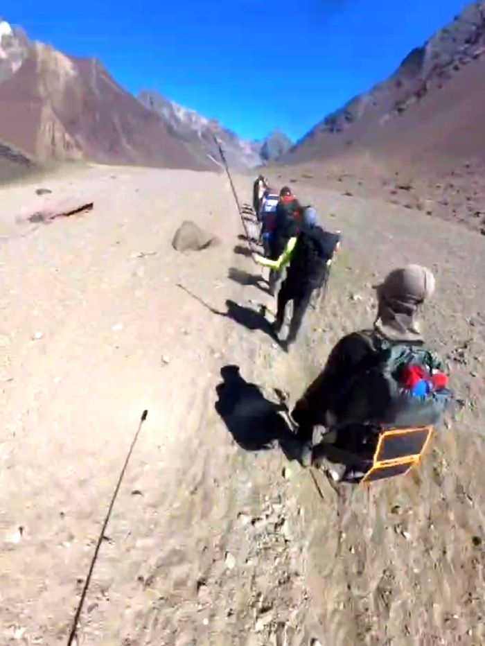 Hola! The "Los Hombres" group made a long trek from Confluencia camp to Aconcagua base camp - Plaza de Mulas. We covered 18 km with a 1000 meter elevation gain in 7 hours. These are the dry numbers that hide the strength and endurance of our group. Tomorrow is a rest and a short walk around the area of the base camp.