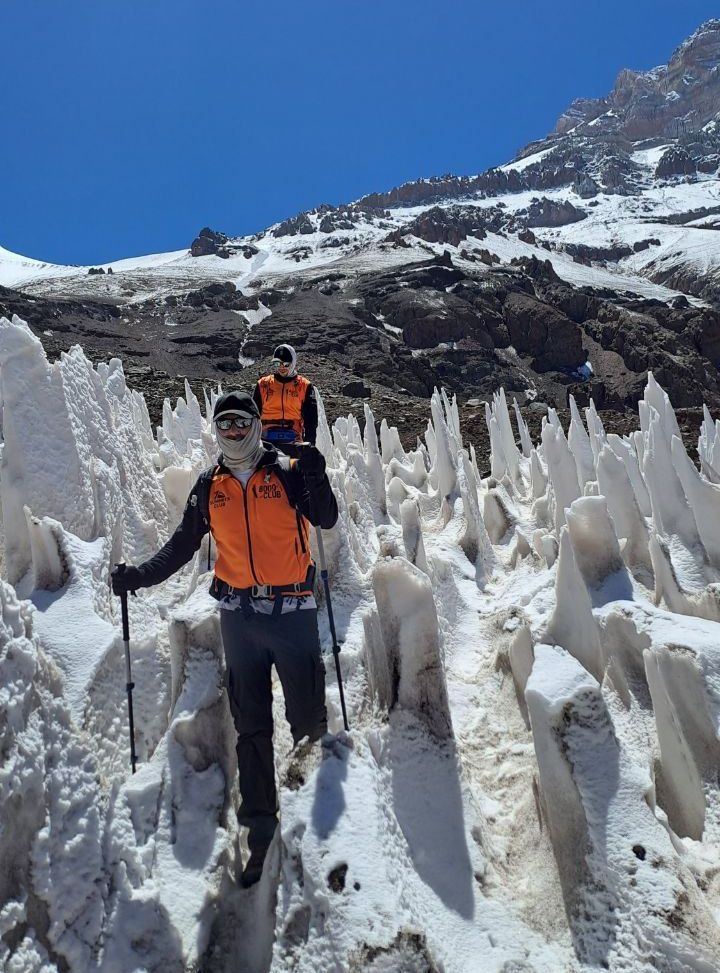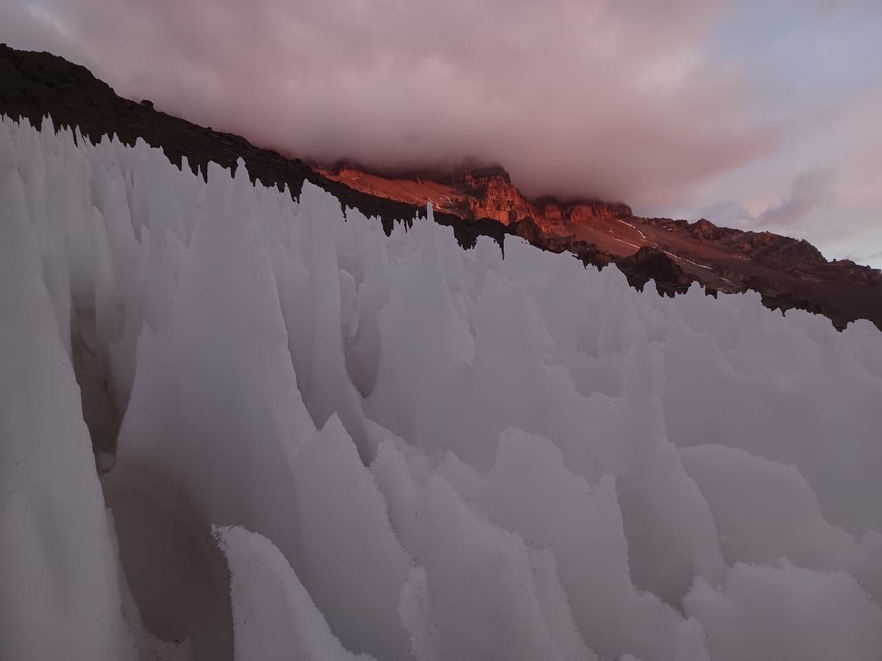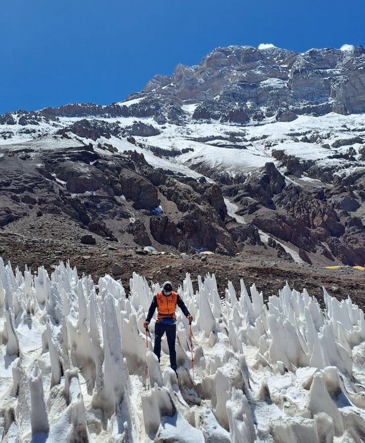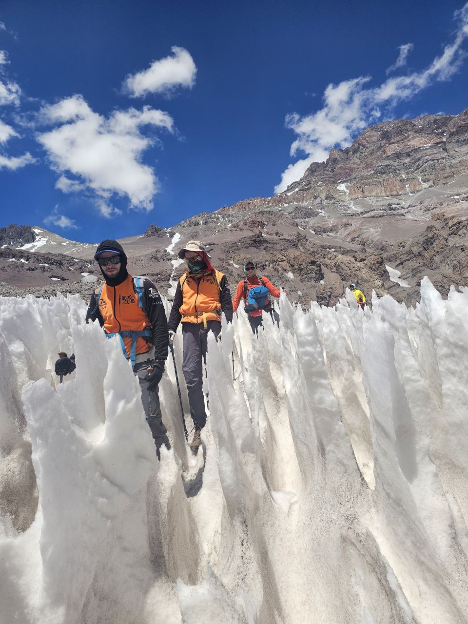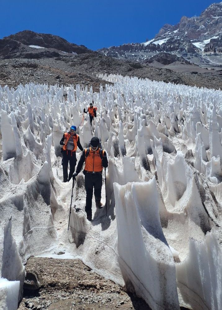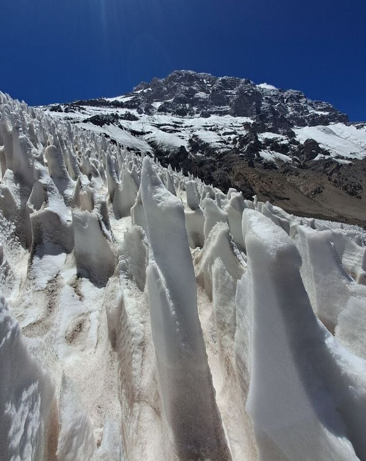 Hola! The "Los Hombres" group today had a rest day after a long trek from Confluencia to Plaza de Mulas. After lunch, we decided to go on an excursion to an abandoned shelter. On the way, we had to cross calgasporas (aka penitentes). It turned out to be a quite difficult task. But we managed!