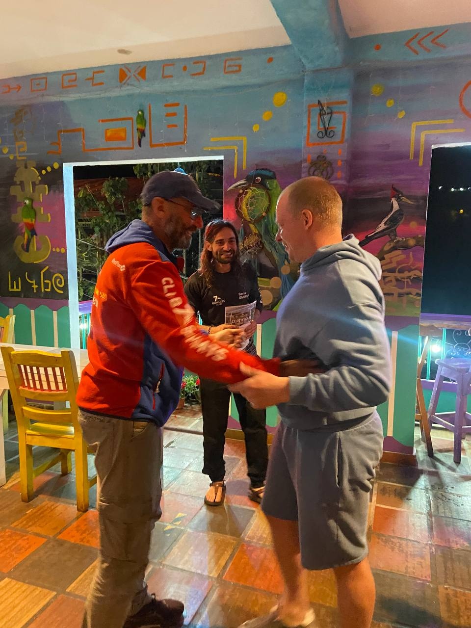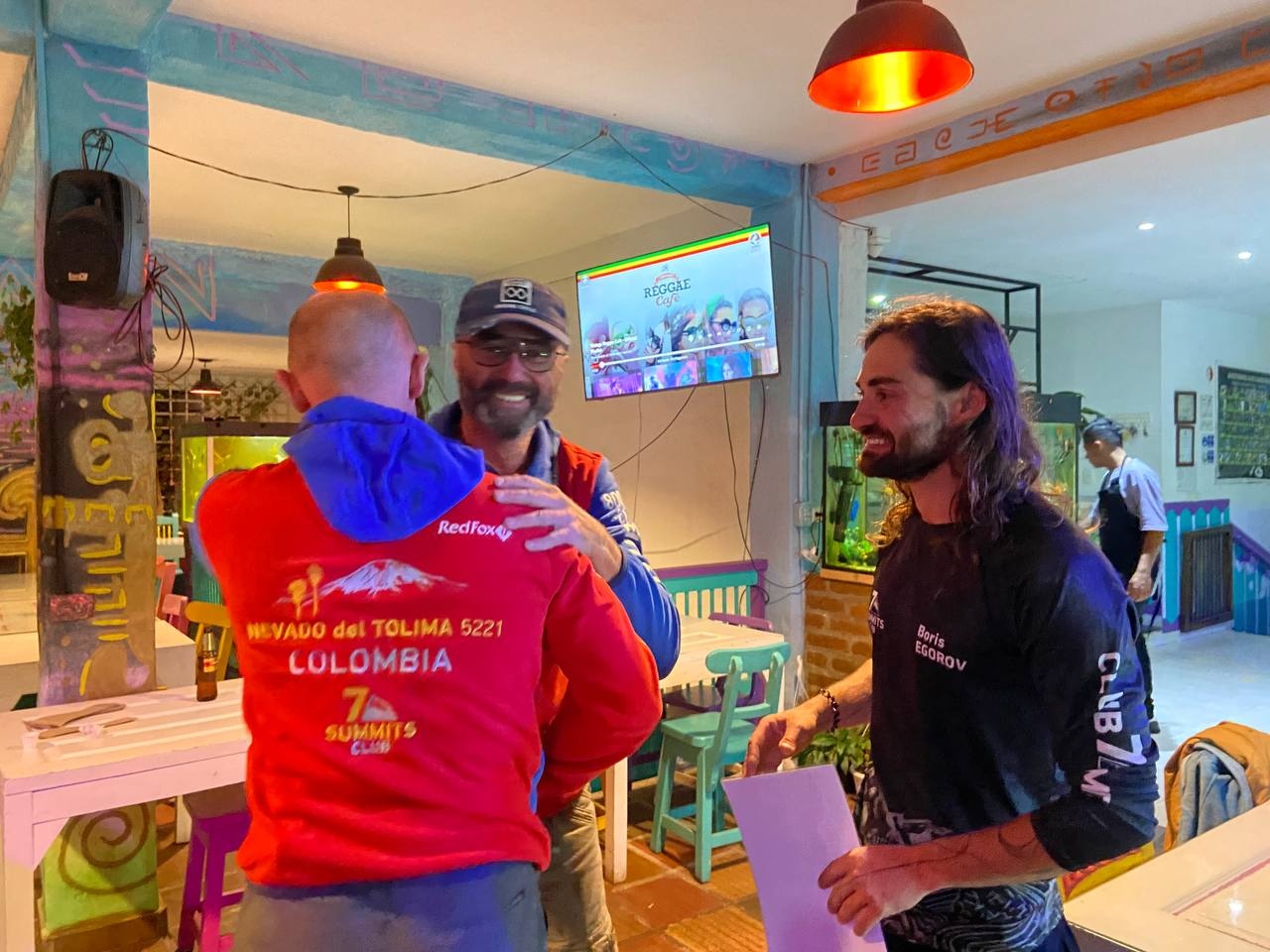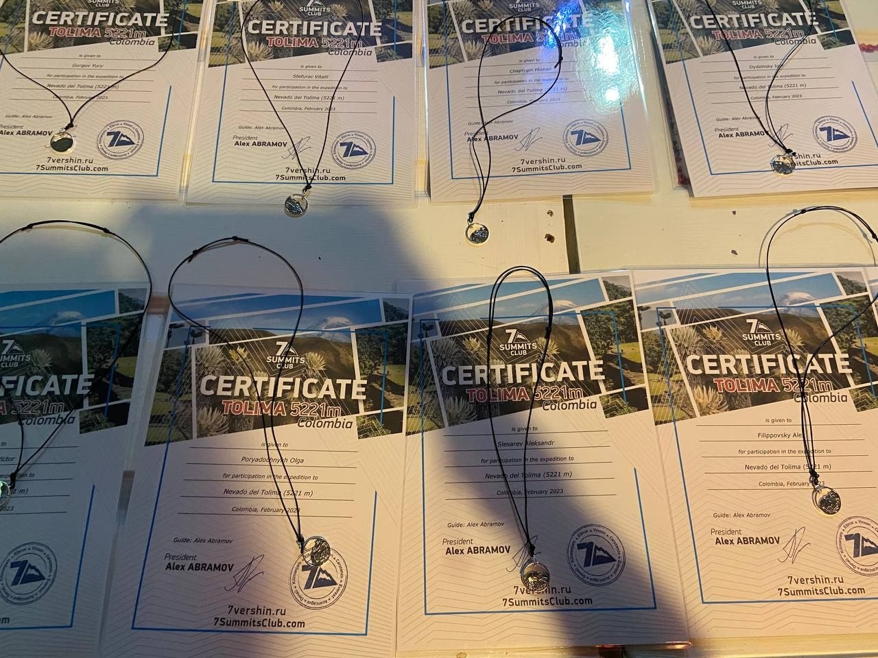 The team is happy! Toasts, congratulations, smiles, loud laughter! Everyone received well-deserved silver medals and certificates for the successful ascent on the Nevado Del Tolima volcano!