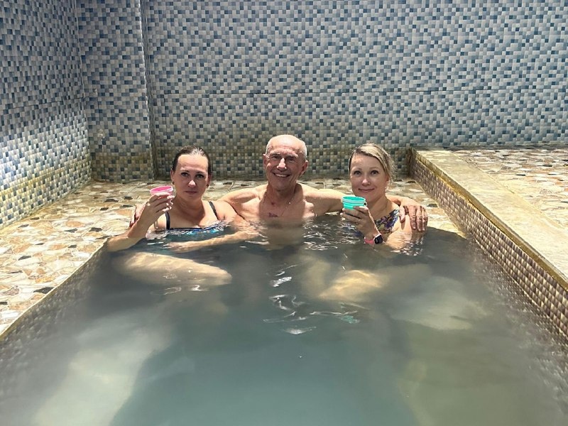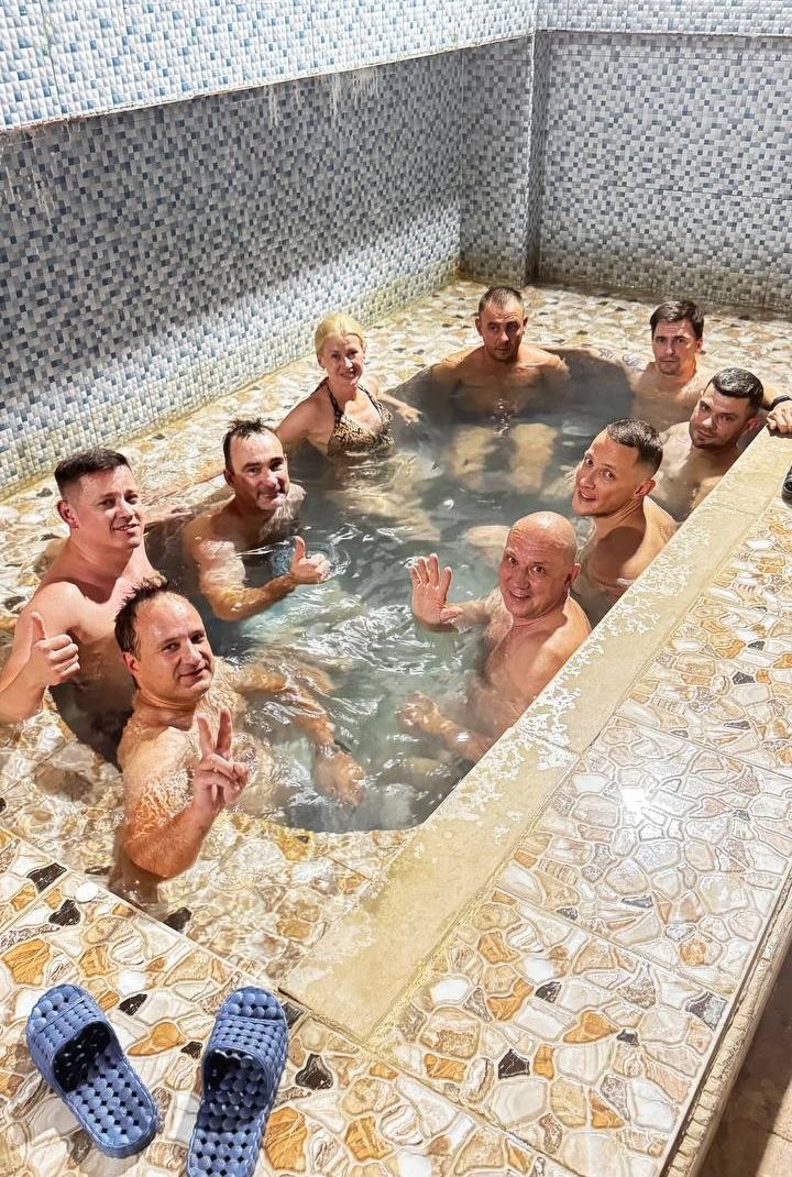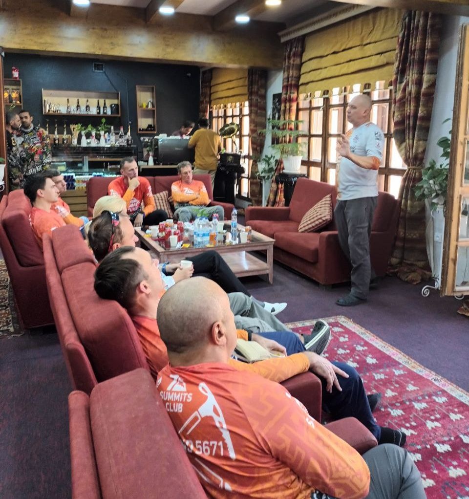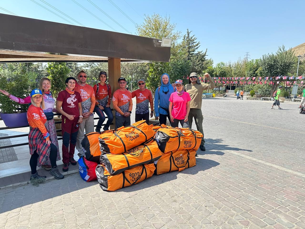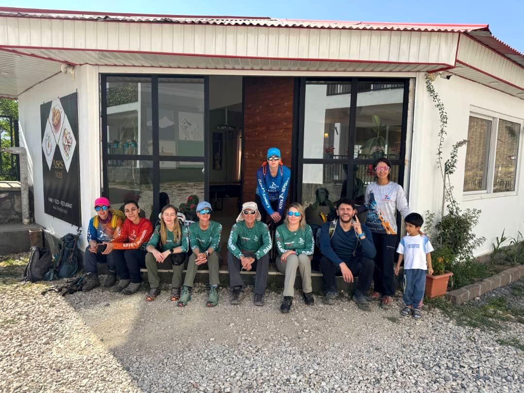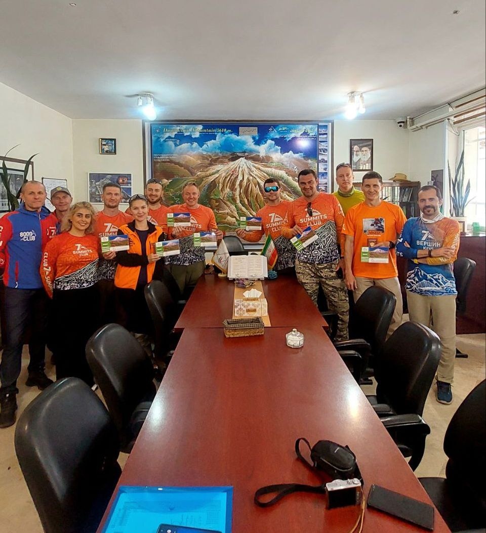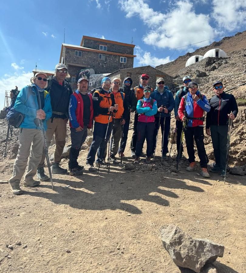 Greetings from Iran! The "Oktyabryata" group is briskly following its itinerary. Today we moved to the wonderful Arses Motel near Damavand. The day began with an ascent to Mount Tochal, 3,964 meters (12,500 ft) – an easy climb along a well-trodden trail with a beautiful panorama of Tehran. At the summit, despite the haze, we had a clear view of our main destination – the Damavand volcano itself. There, at the top of Tochal, we chatted with friendly Iranian police officers and took a group photo. Then, after descending by cable car to Tehran, we headed to the foot of Damavand, to the Iranian Mountaineering Federation House, where we obtained permits and took the traditional photo. From the Federation House, it's just half an hour to our beautiful "Arses" (mentioned above), where a wonderful lunch and afternoon rest awaited us. In the evening, we visited the thermal springs and dined at our favorite kebab shop in Larijan. Everything is on plan; tomorrow we ascend to camp at 4,200 meters.