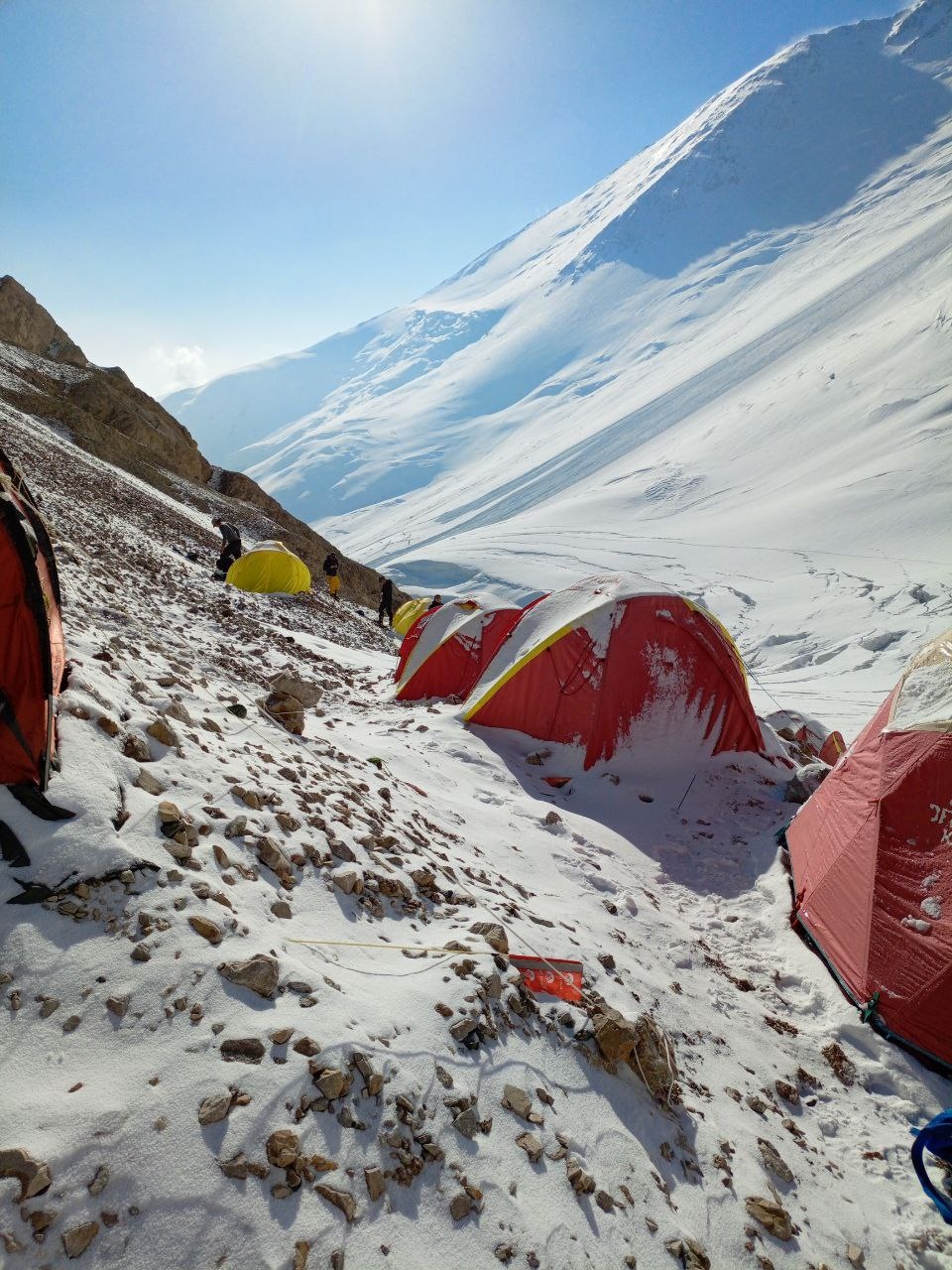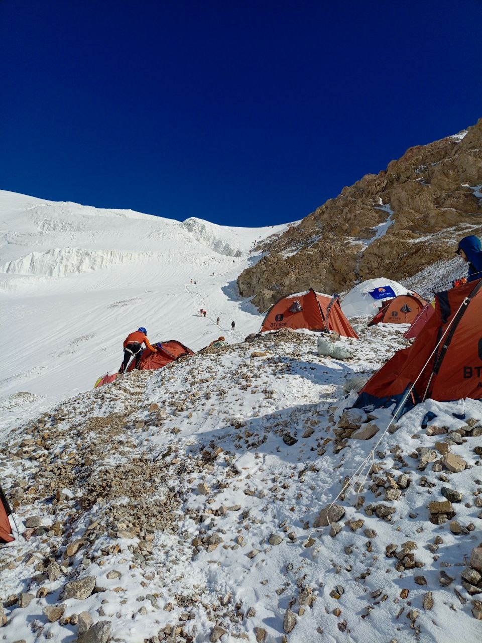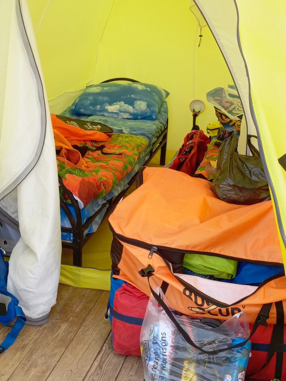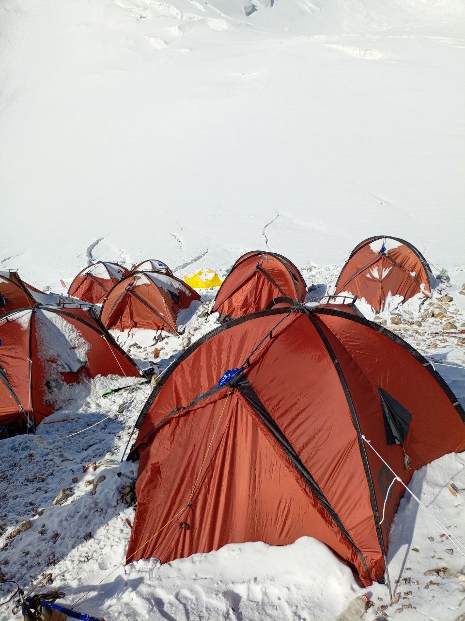 Greetings from Kyrgyzstan from Lenin Peak from the group "Always ready-s"! We are already in the First Camp at 4,400 m! We reached it at a good pace in 5 hours. We didn't have time for lunch according to the schedule, but, of course, they were waiting for us, and the stuffed peppers were universally approved. The weather is not good, it is even more or less acceptable before lunch, which we took advantage of, today we held snow and ice classes, remembered the skills of using jumars and ascender devices. After lunch, it was swept away, we rest in comfortable tents with mattresses, pillows and blankets, and electricity is supplied to each tent, a light bulb and a pilot for charging. It's somehow more pleasant to experience bad weather this way.
