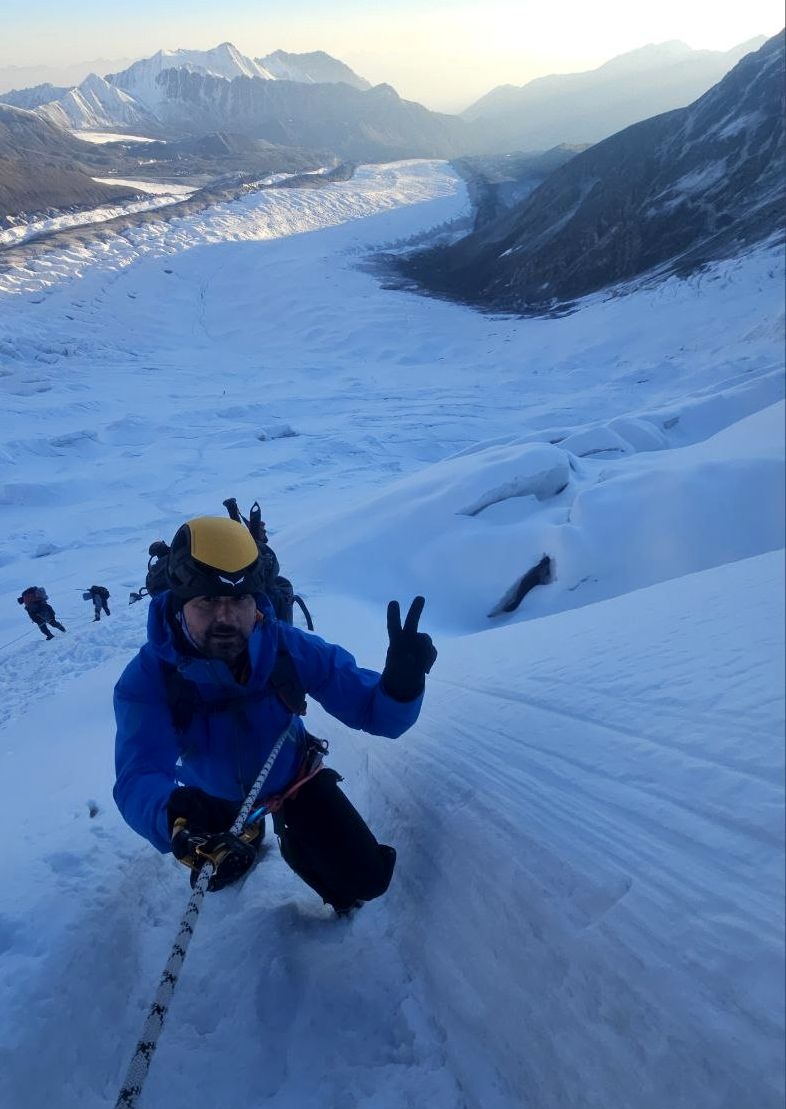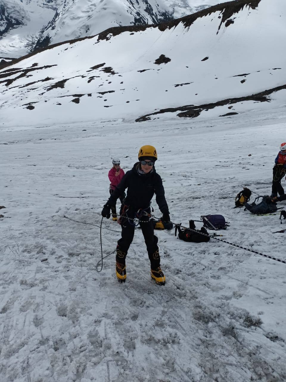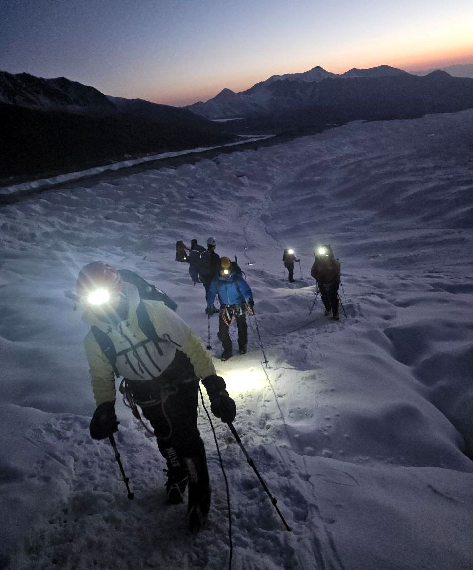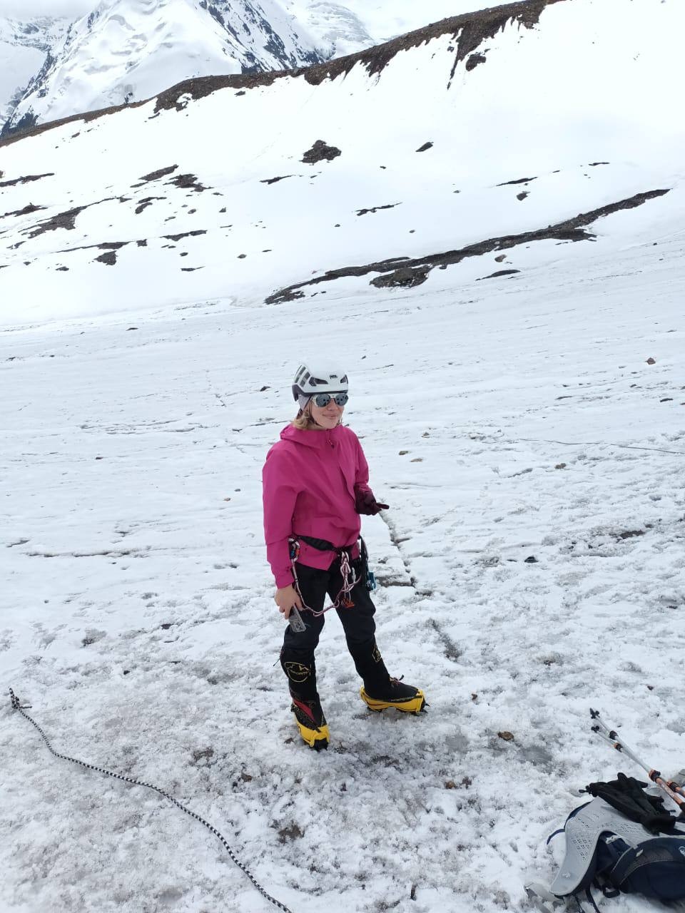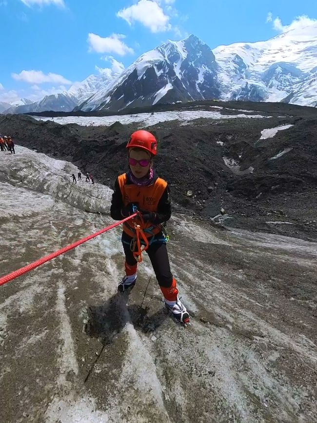 Greetings from the Pamirs! The group "Gentlemen and Fairies" spent two days in the First Camp of Lenin Peak. To acclimatize, we went to Domashny Peak, up to a height of 4800 meters.  And today we held snow and ice classes.  We have mastered the skills of moving on ropes. Tomorrow we will go to the Second Camp for two nights, and we also plan to climb the Razdelnaya peak.