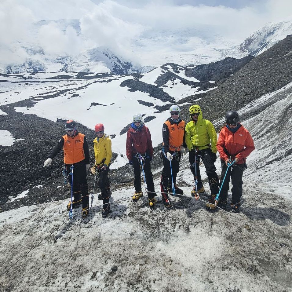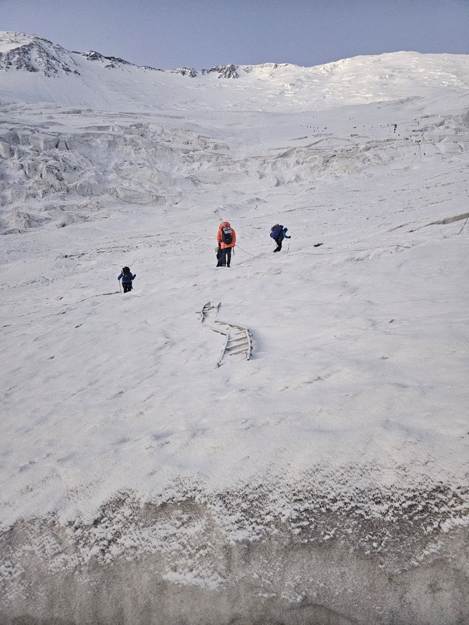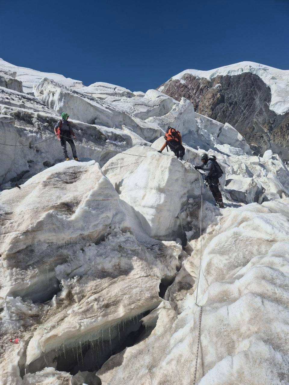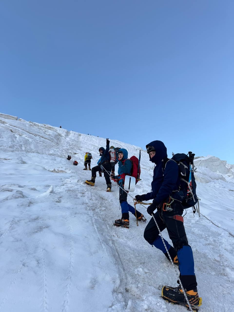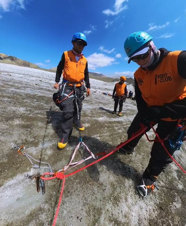 Greetings from the Pamirs! The group "Gentlemen and Fairies" spent two days in the First Camp of Lenin Peak. To acclimatize, we went to Domashny Peak, up to a height of 4800 meters.  And today we held snow and ice classes.  We have mastered the skills of moving on ropes. Tomorrow we will go to the Second Camp for two nights, and we also plan to climb the Razdelnaya peak.