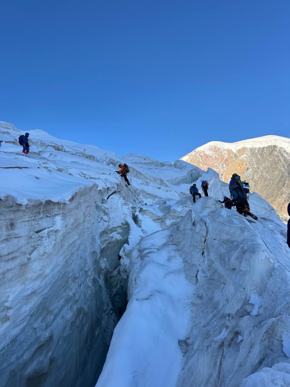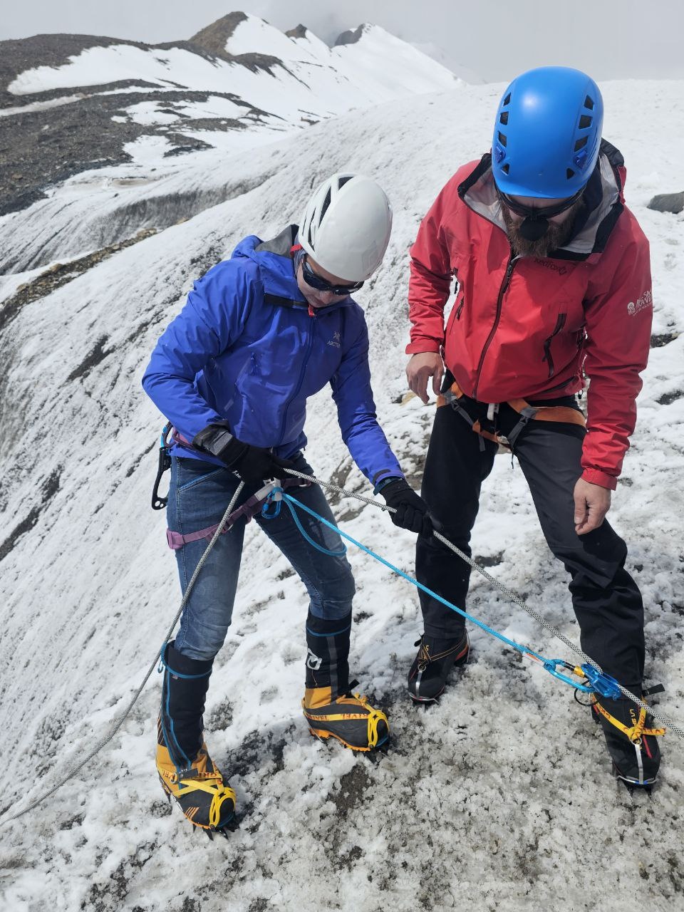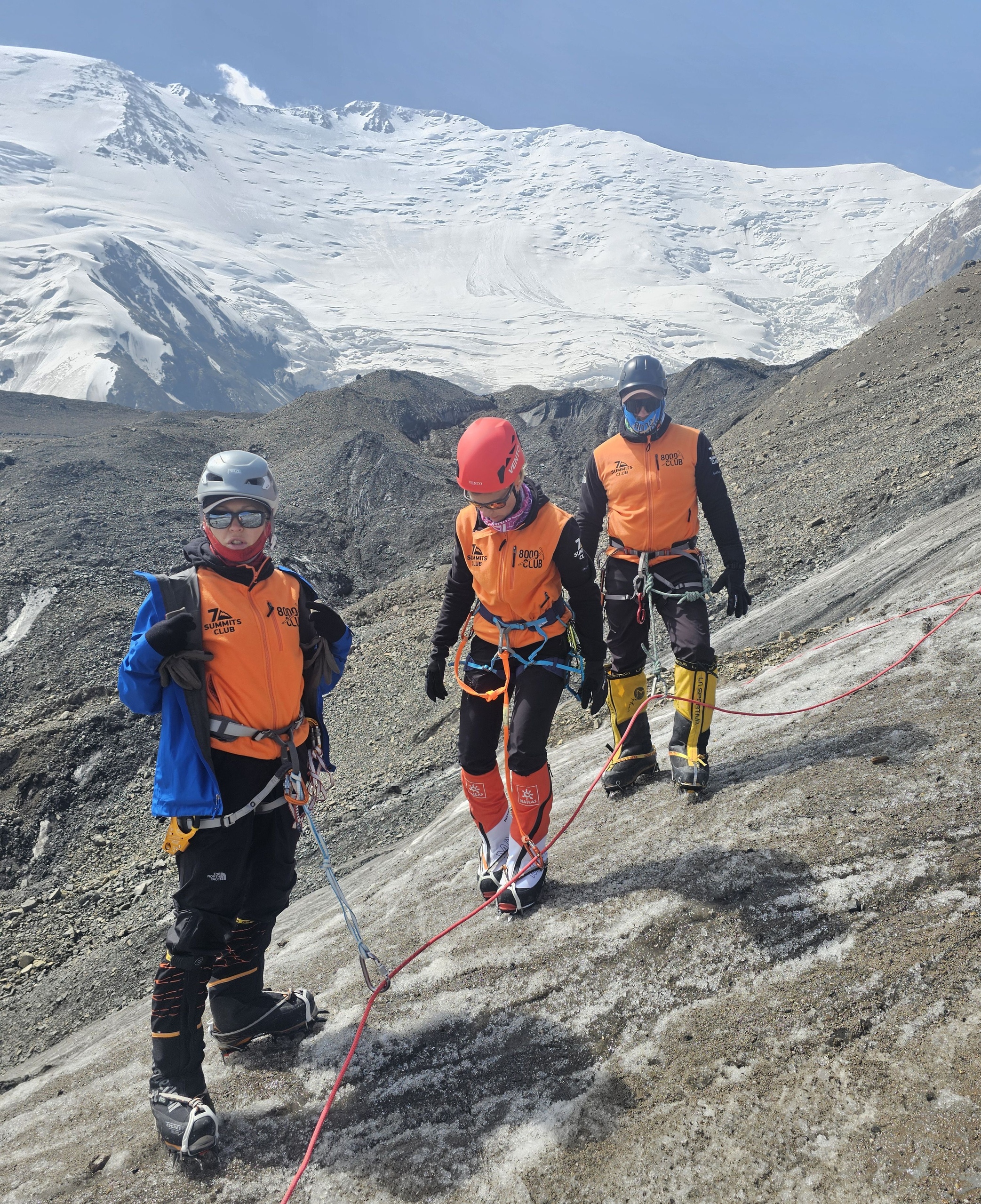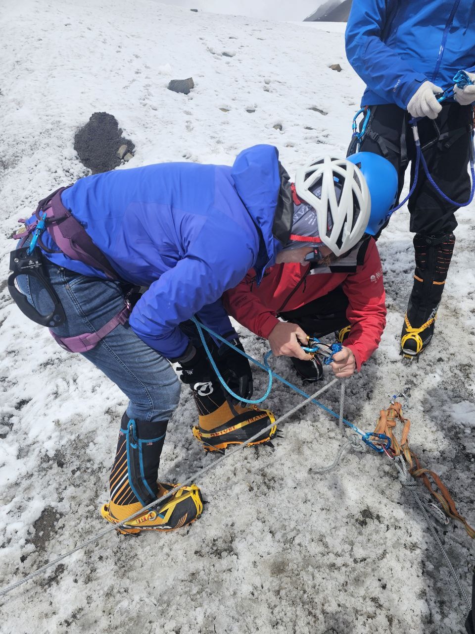Greetings from the Pamirs! The group "Gentlemen and Fairies" spent two days in the First Camp of Lenin Peak. To acclimatize, we went to Domashny Peak, up to a height of 4800 meters.  And today we held snow and ice classes.  We have mastered the skills of moving on ropes. Tomorrow we will go to the Second Camp for two nights, and we also plan to climb the Razdelnaya peak.