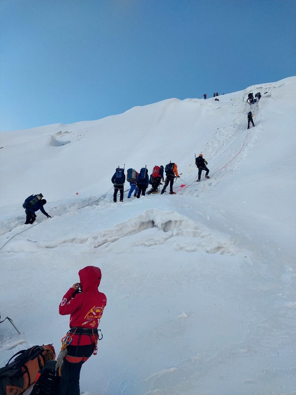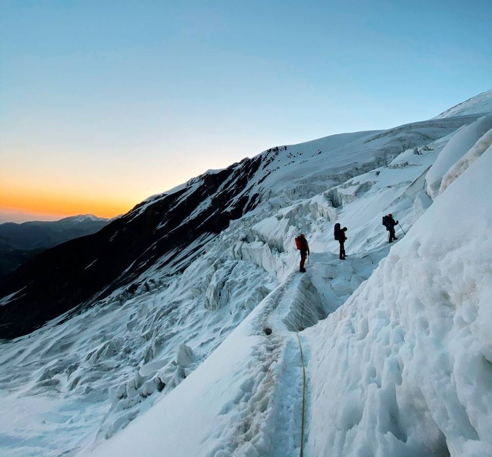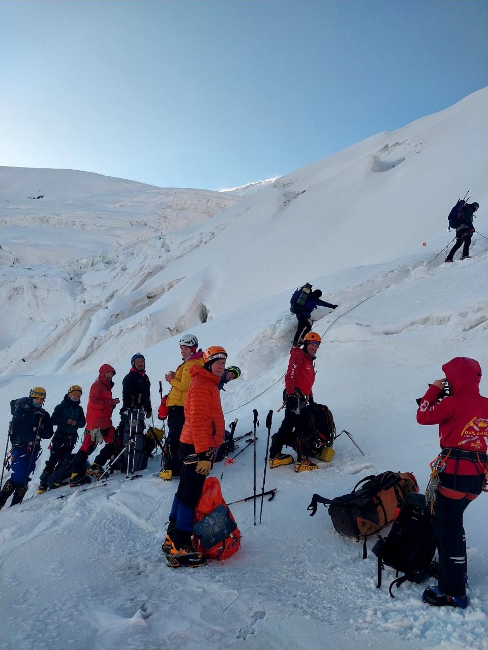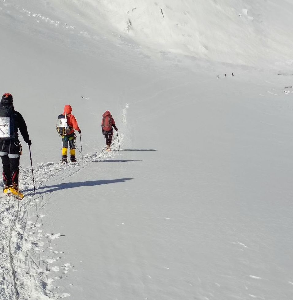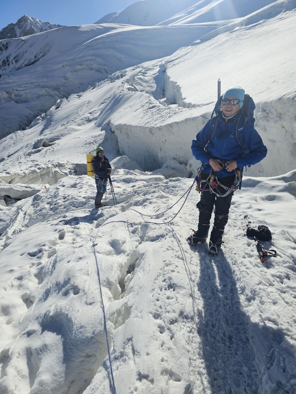 Greetings from the Pamirs! The group "Gentlemen and Fairies" spent two days in the First Camp of Lenin Peak. To acclimatize, we went to Domashny Peak, up to a height of 4800 meters.  And today we held snow and ice classes.  We have mastered the skills of moving on ropes. Tomorrow we will go to the Second Camp for two nights, and we also plan to climb the Razdelnaya peak.