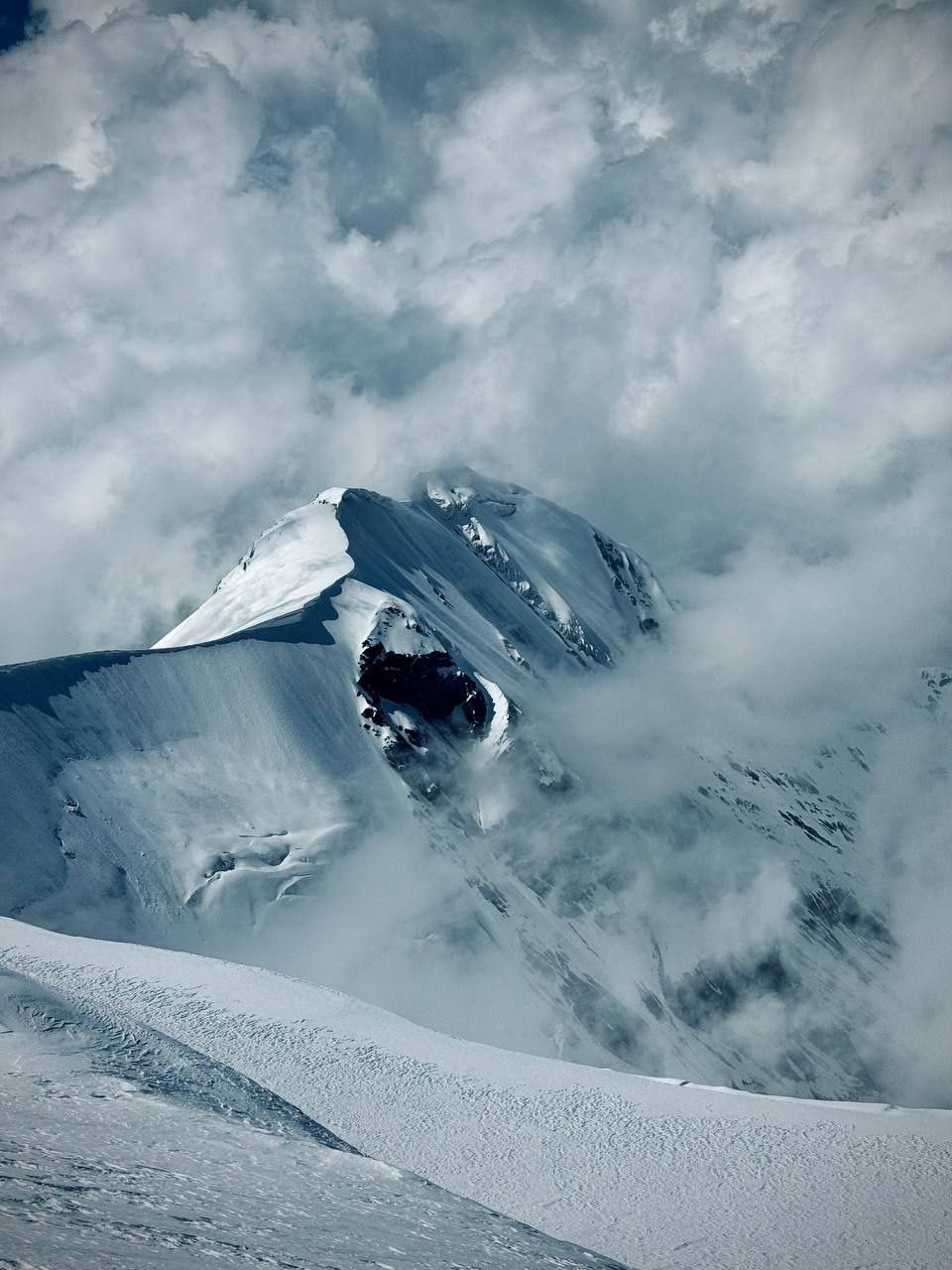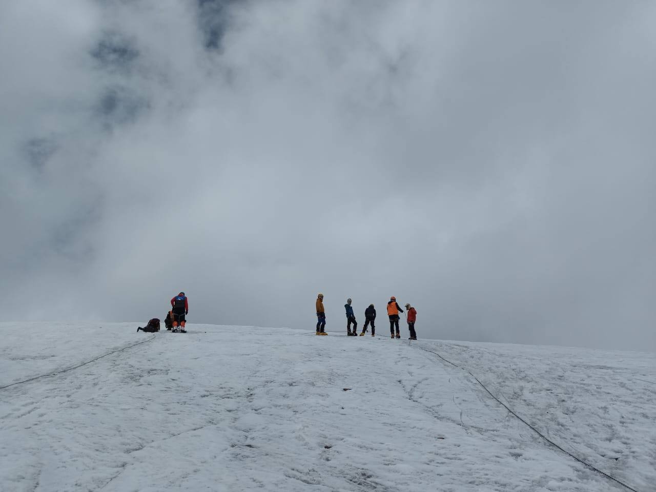 Our route went along rocks and snow-ice slopes. At about 6700 there was a problematic section called "Knife", where ropes were fixed, without which we would have had to sweat a little. Closer to midday the weather began to deteriorate, there was a thick fog, snow. There was also a strong wind at the top. We took a few photos and began the descent. By 19:00 we were in the third camp.