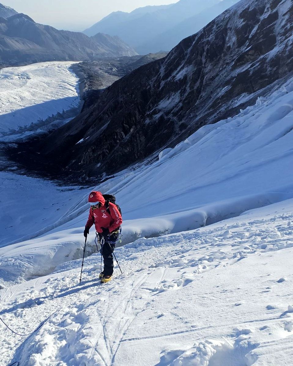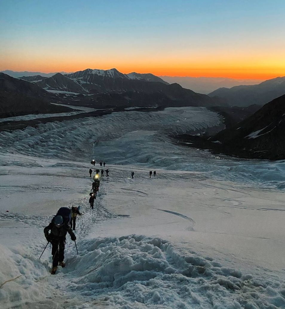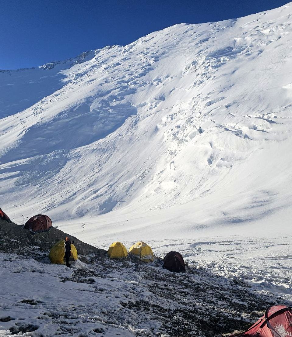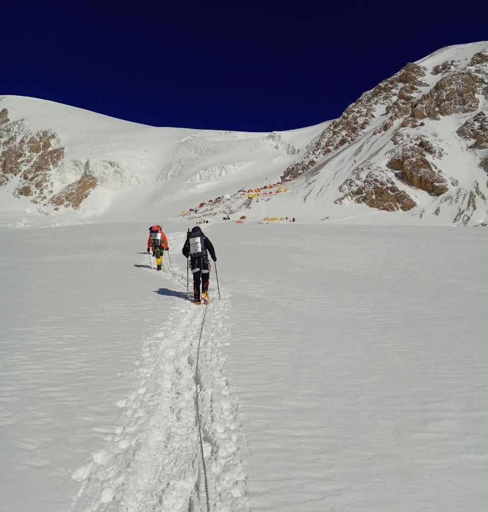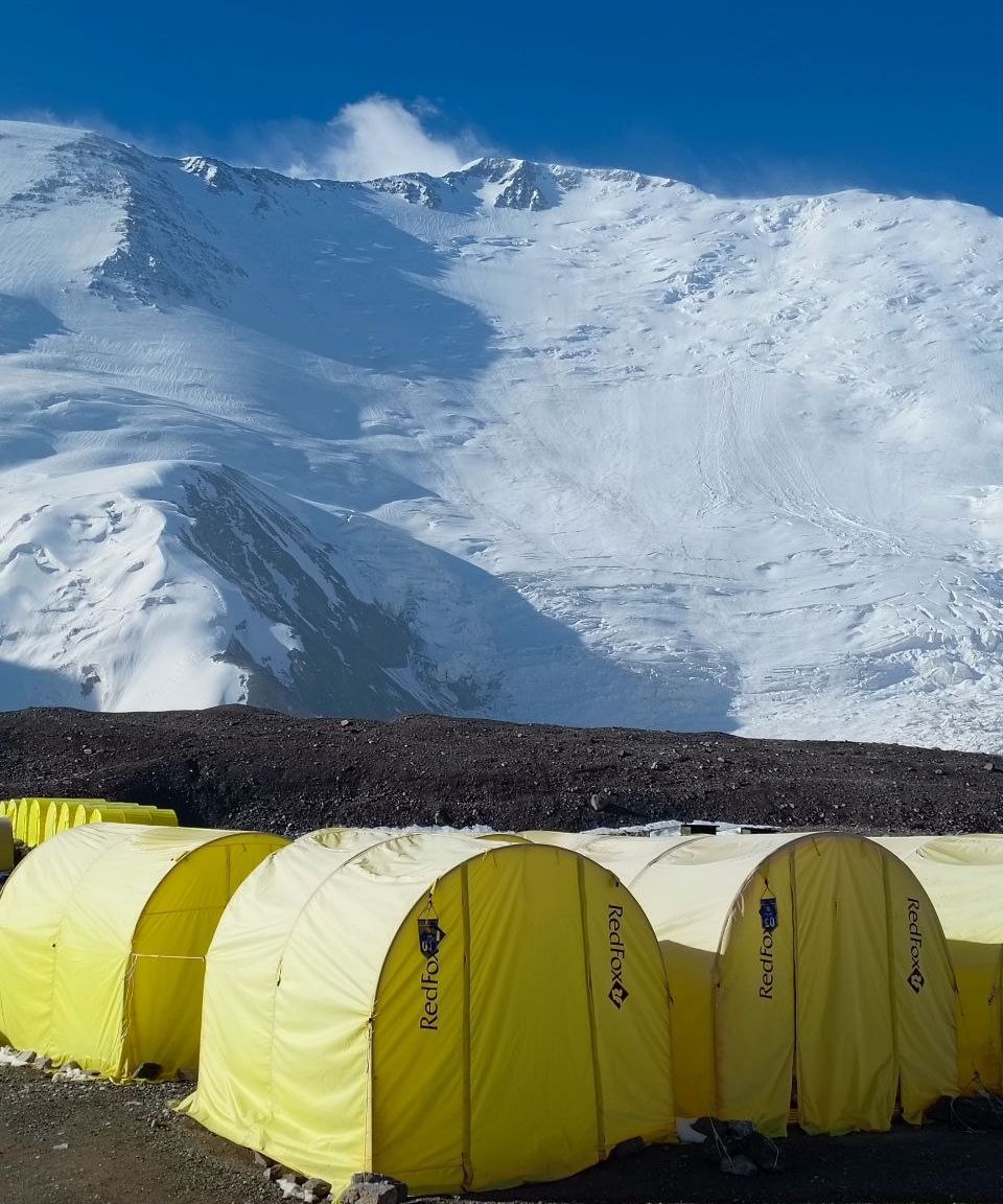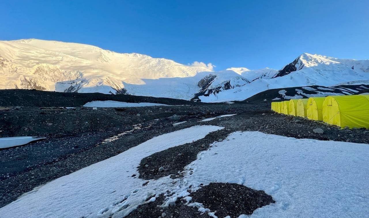 Hello everyone from Kyrgyzstan! The group of the Club 8000 "Old Buck" today passed a difficult section of the Lenin Glacier, with cracks and icefalls, and reached the second camp at an altitude of 5300 meters. According to the forecast, there was a strong wind on the summit today, we felt it on the "Frying Pan" and below it. Tomorrow we move to the third, assault camp.