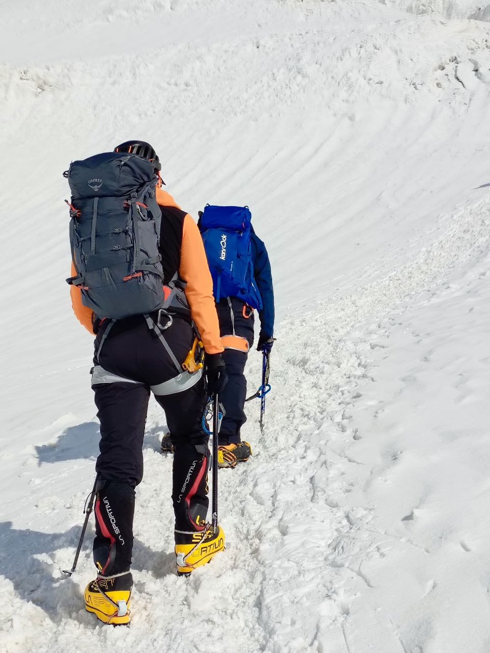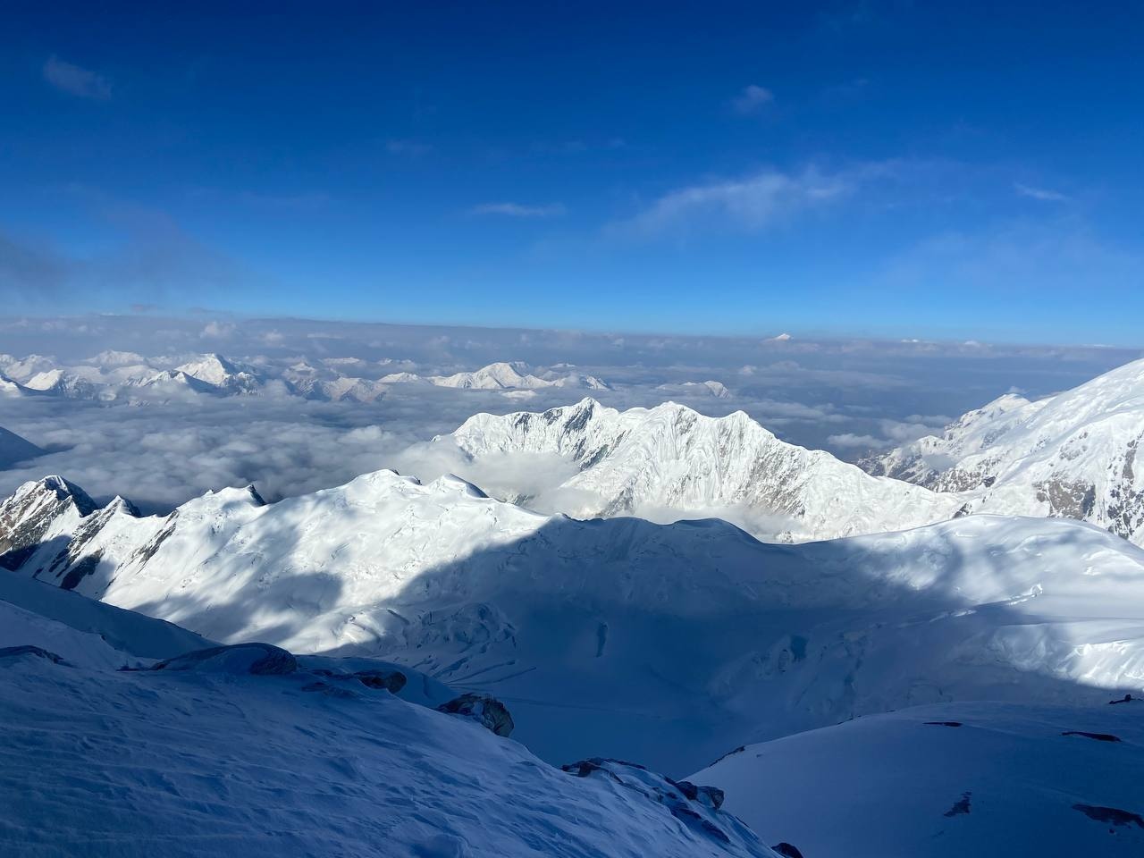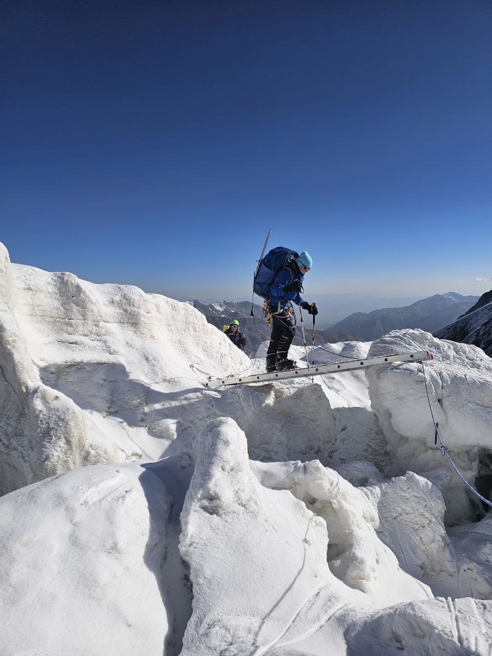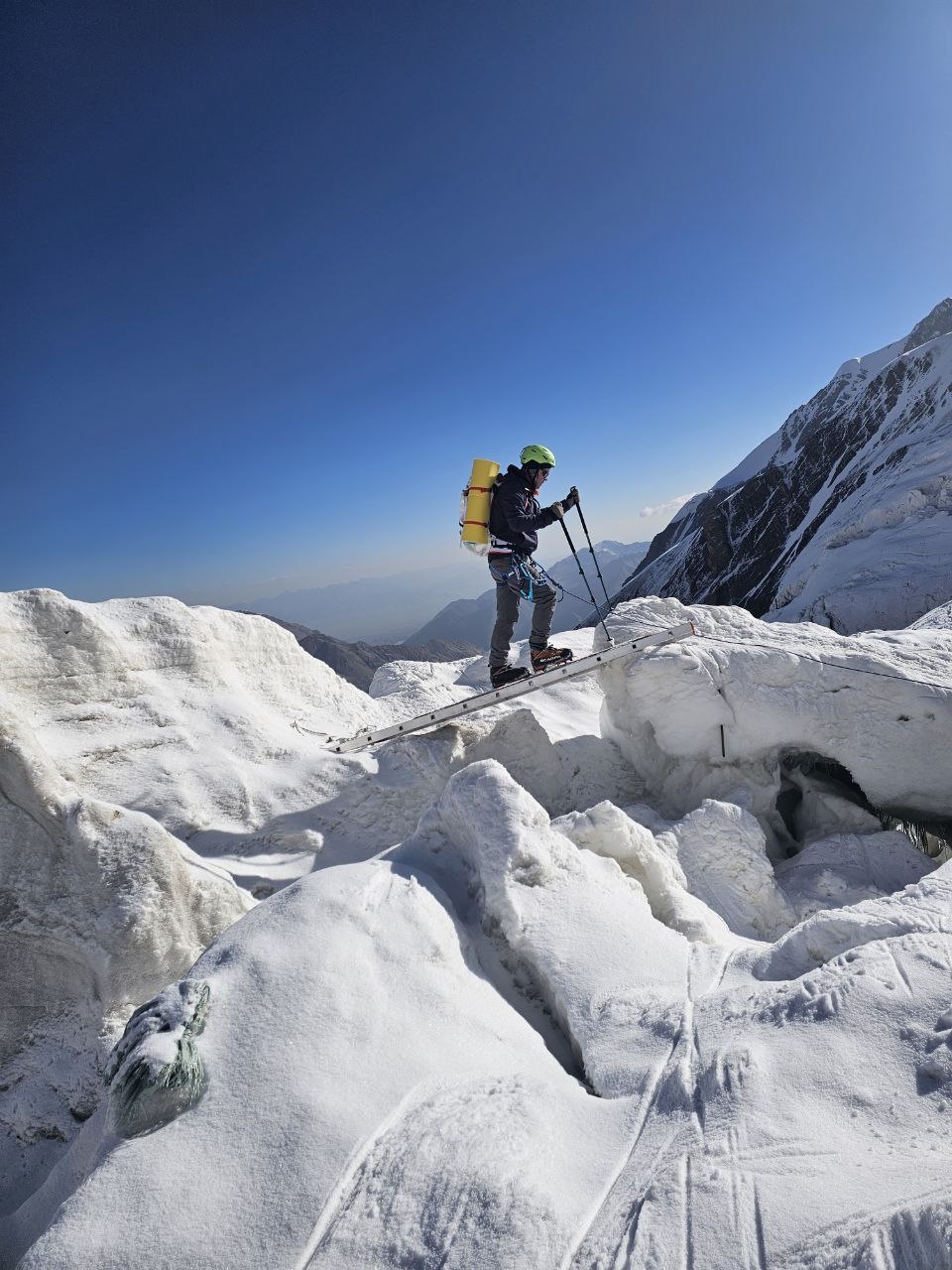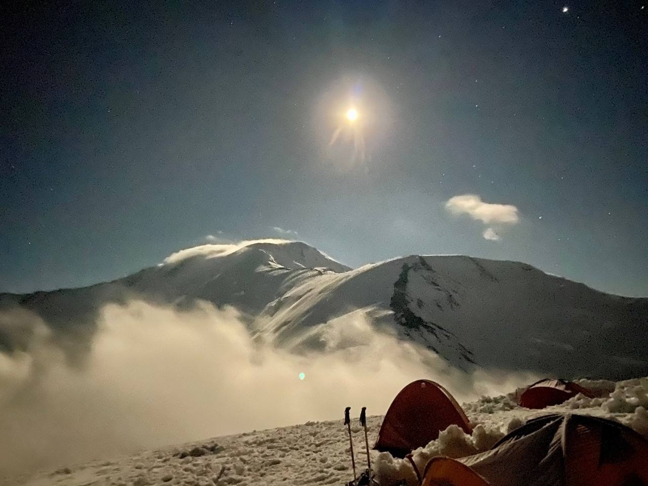 Hello everyone from Kyrgyzstan! The group of the Club 8000 "Old Buck" today passed a difficult section of the Lenin Glacier, with cracks and icefalls, and reached the second camp at an altitude of 5300 meters. According to the forecast, there was a strong wind on the summit today, we felt it on the "Frying Pan" and below it. Tomorrow we move to the third, assault camp.