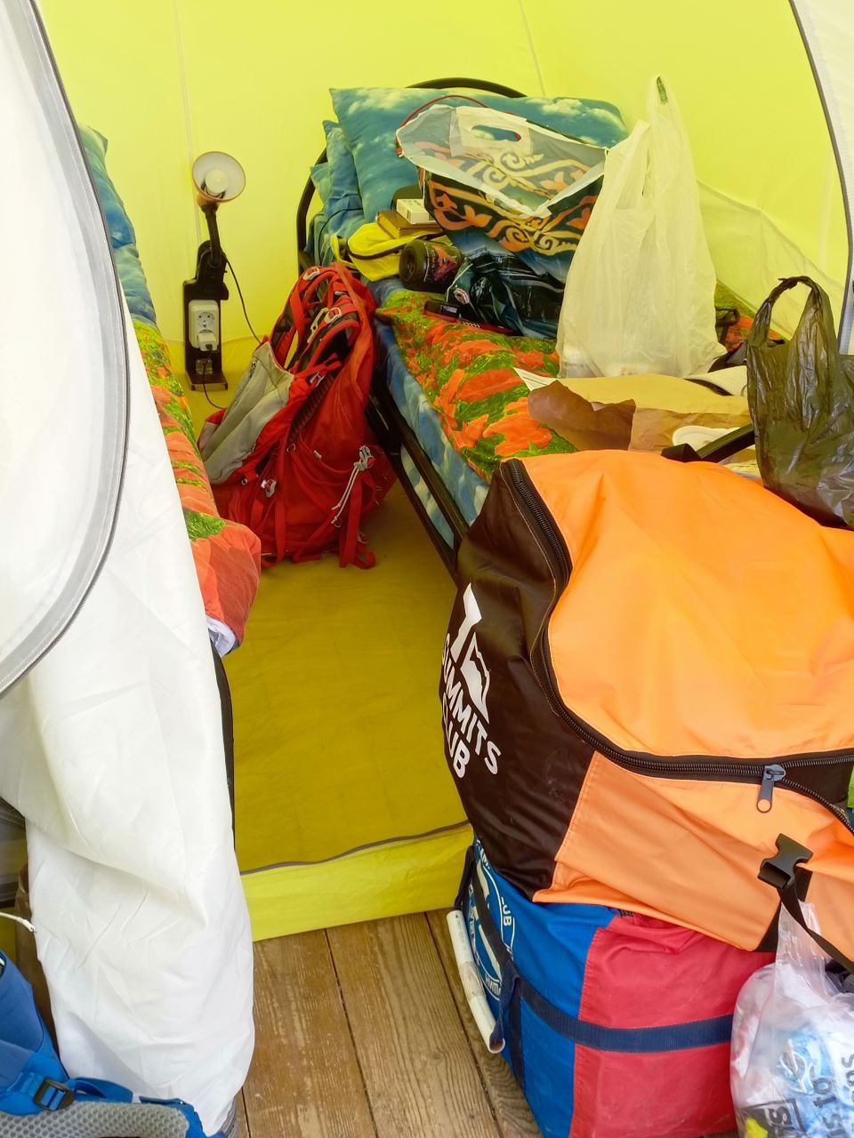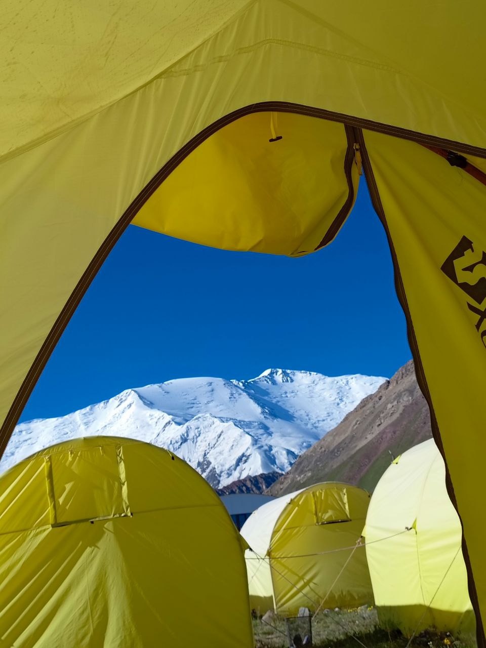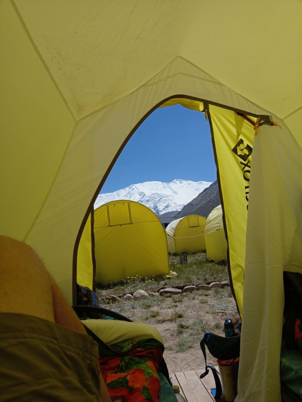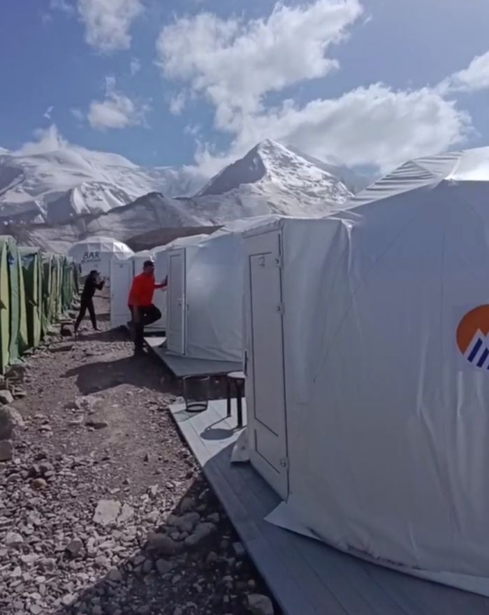 Hello everyone from Kyrgyzstan! The Svet Zhok group arrived at the Lenin Peak base camp. We checked into comfortable yurts. The houses have everything: beds with bed linen, electricity, hot water, a bathroom, and a shower. In general, a full-fledged hotel room, only it is located on a glade at an altitude of 3700, and with a view of Lenin Peak.