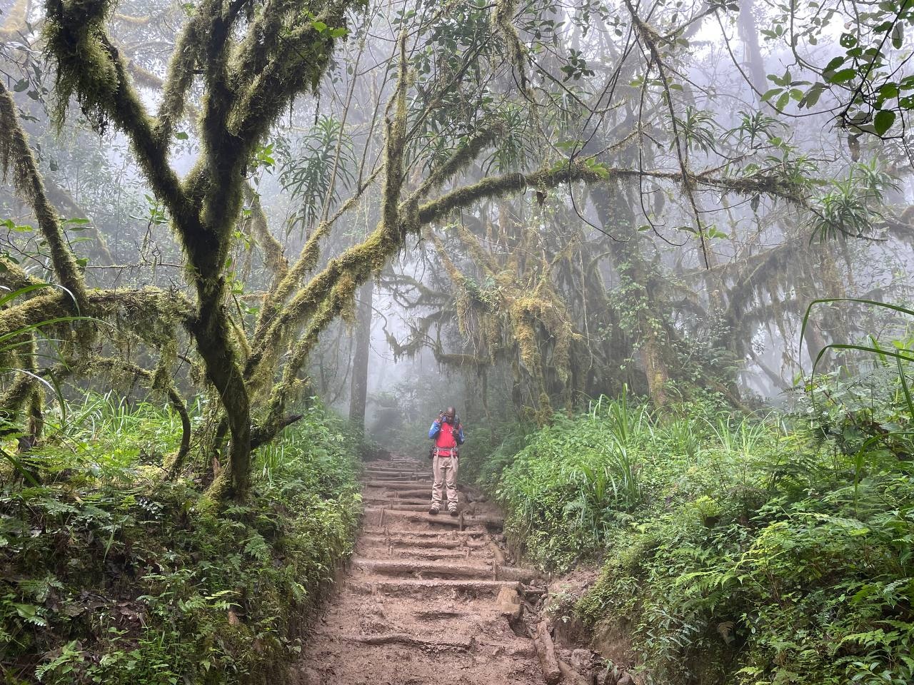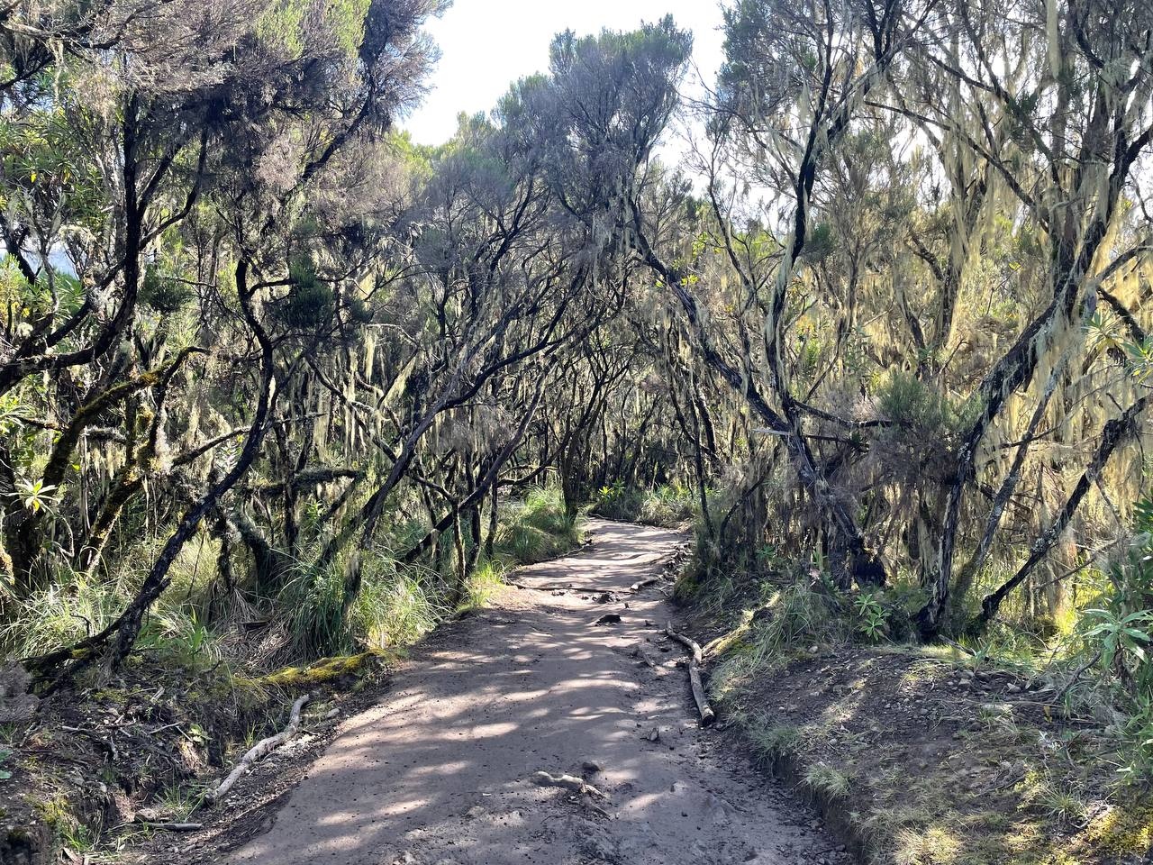 The trail ran through equatorial forest with giant trees, vines, lichens, and tree ferns for almost the entire day. Closer to camp, the forest gave way to thickets of giant heather. Along the way, we were accompanied by monkeys, bridges, and waterfalls.