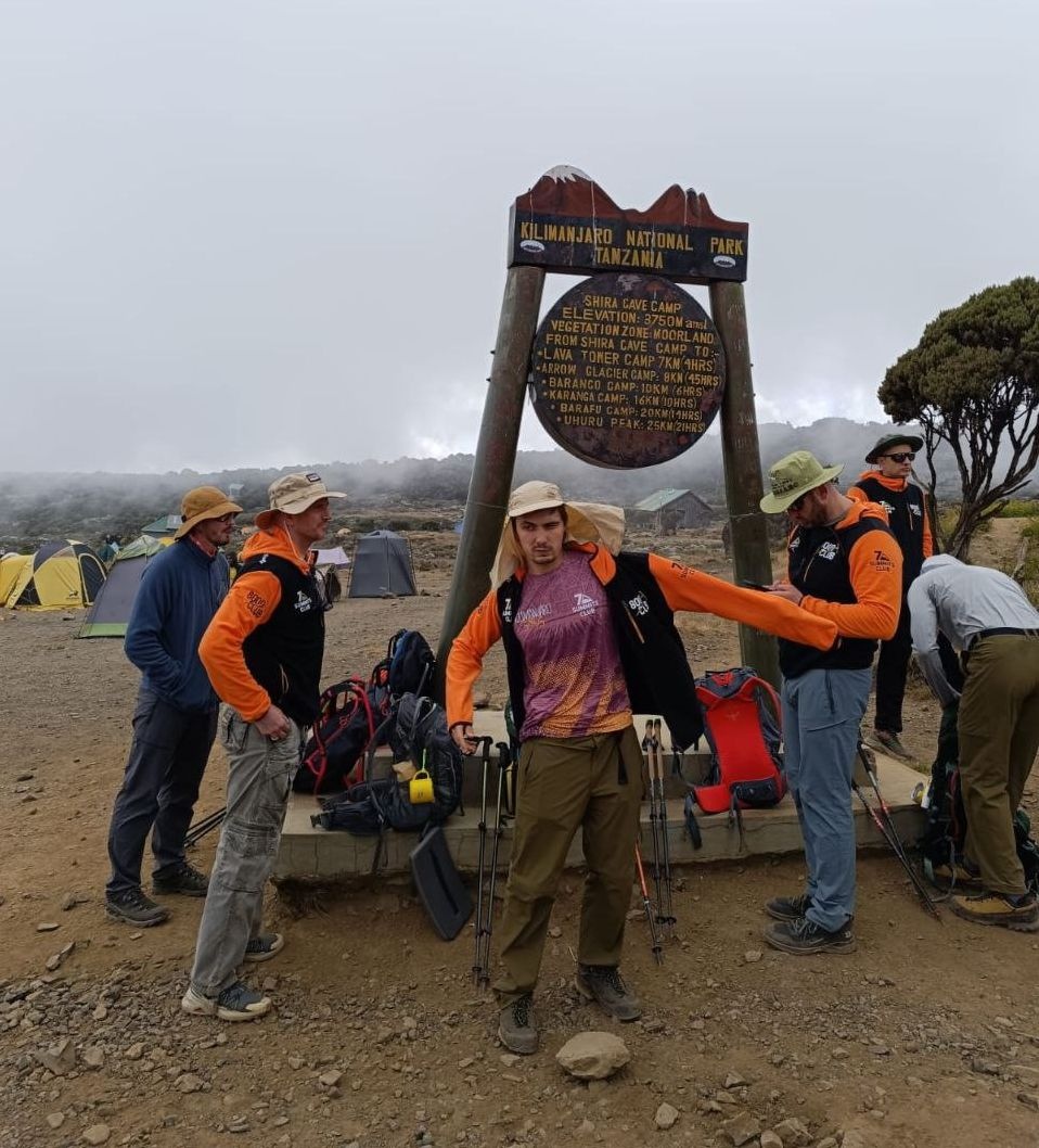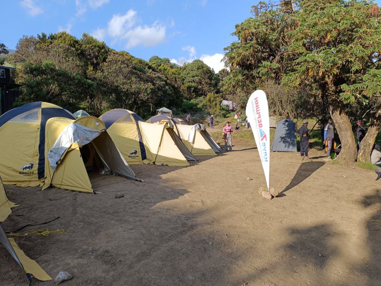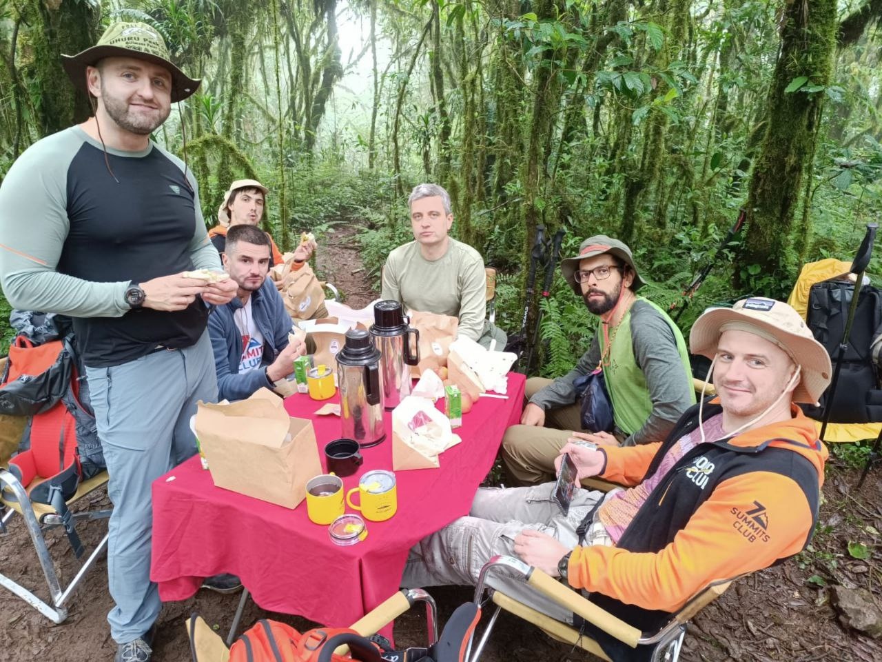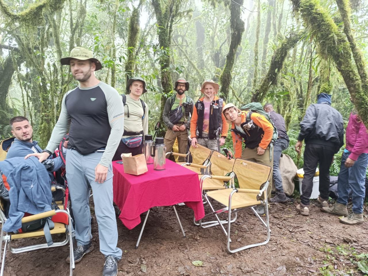 Hello, 7 Summits! The Bang Brothers team safely climbed to Machame Camp at an altitude of 3000 m yesterday. We were lucky with the weather, the rain accompanied us only halfway. And then we came out of the cloud, so we arrived at the camp dry. We ate well, slept well. We will soon continue our way up, right after a delicious breakfast.