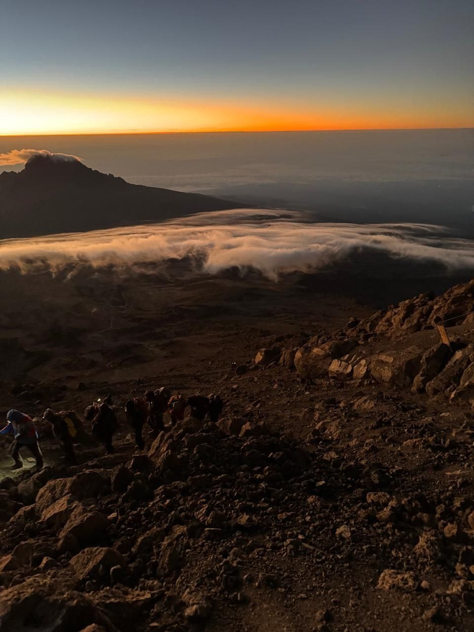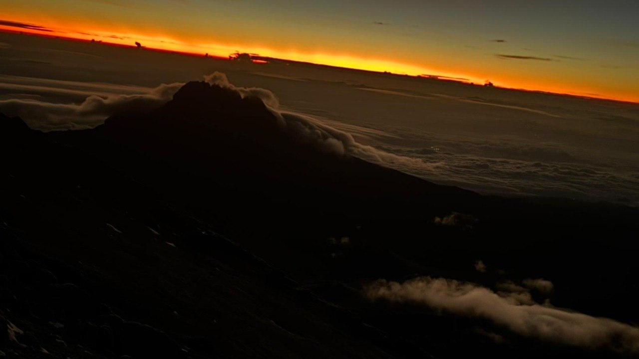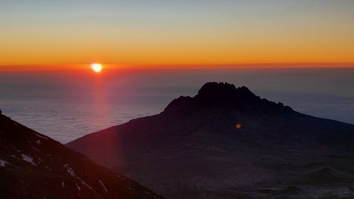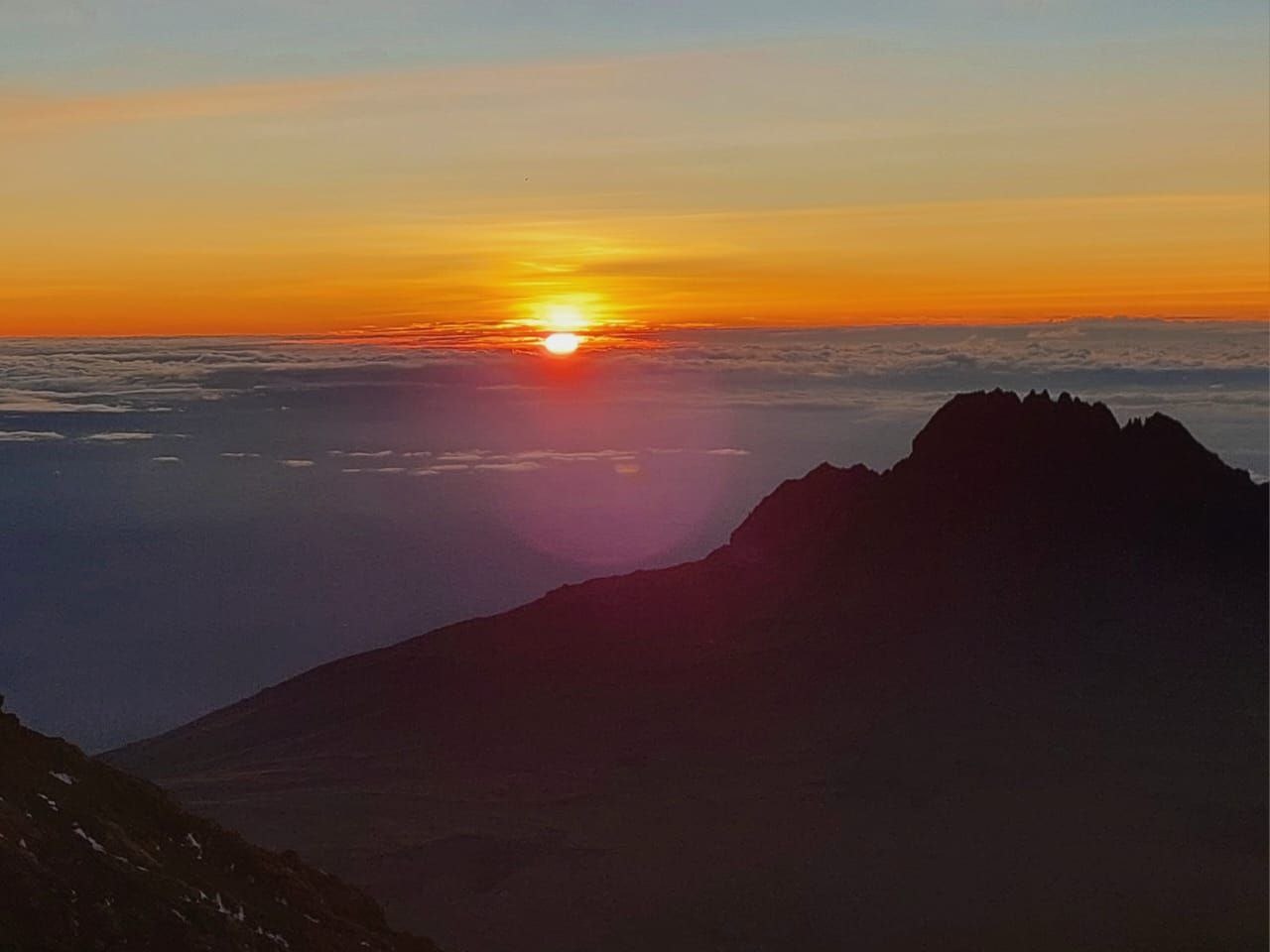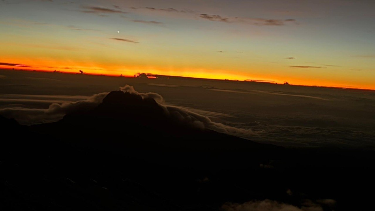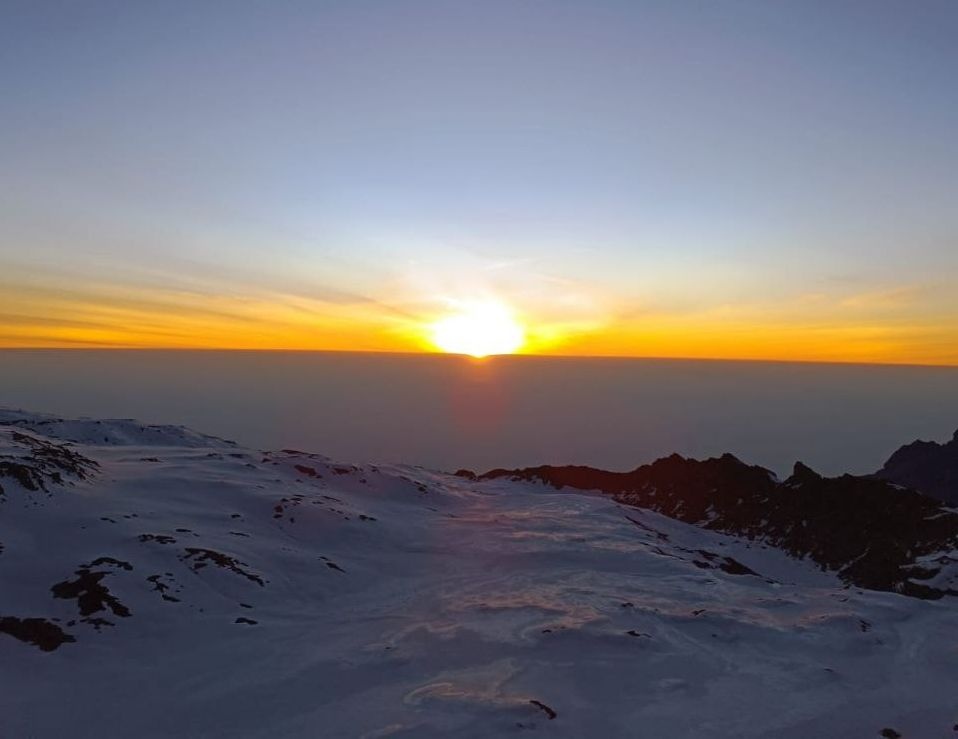 Nighttime shots of Kilimanjaro's crater in the light of the full moon, tea, and your favorite songs to help you fight off the drowsiness that rolls in like waves. And then, off you go again. Two more hours of work lie ahead, now at altitude. An hour and a half later, as soon as you pass Stella Point, the magic of sunrise begins. And you see with your own eyes how the valleys of golden Africa are bathed in the rays of the sun. This is something that can't be described in words, videos, or photos; you have to see it with your own eyes!