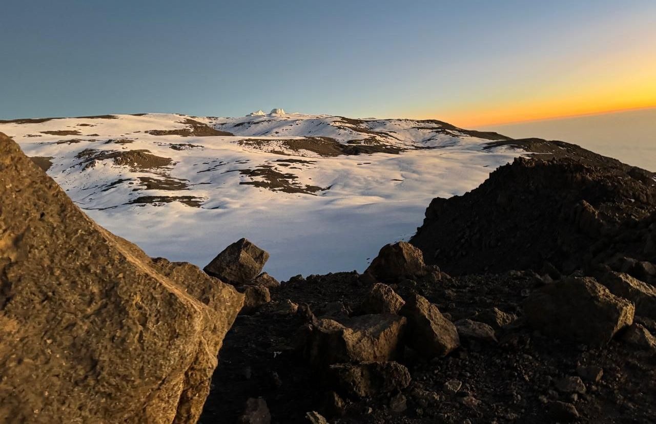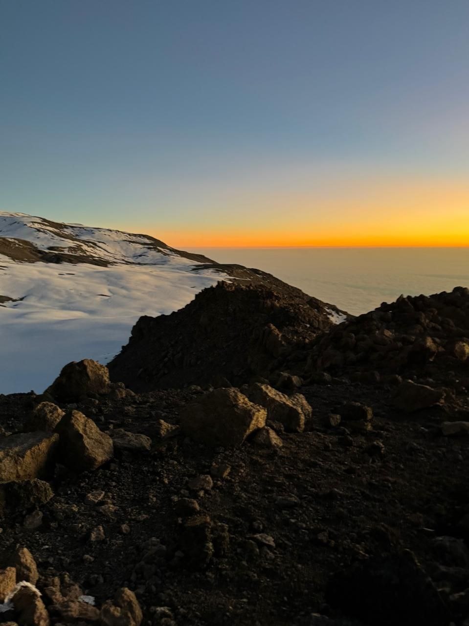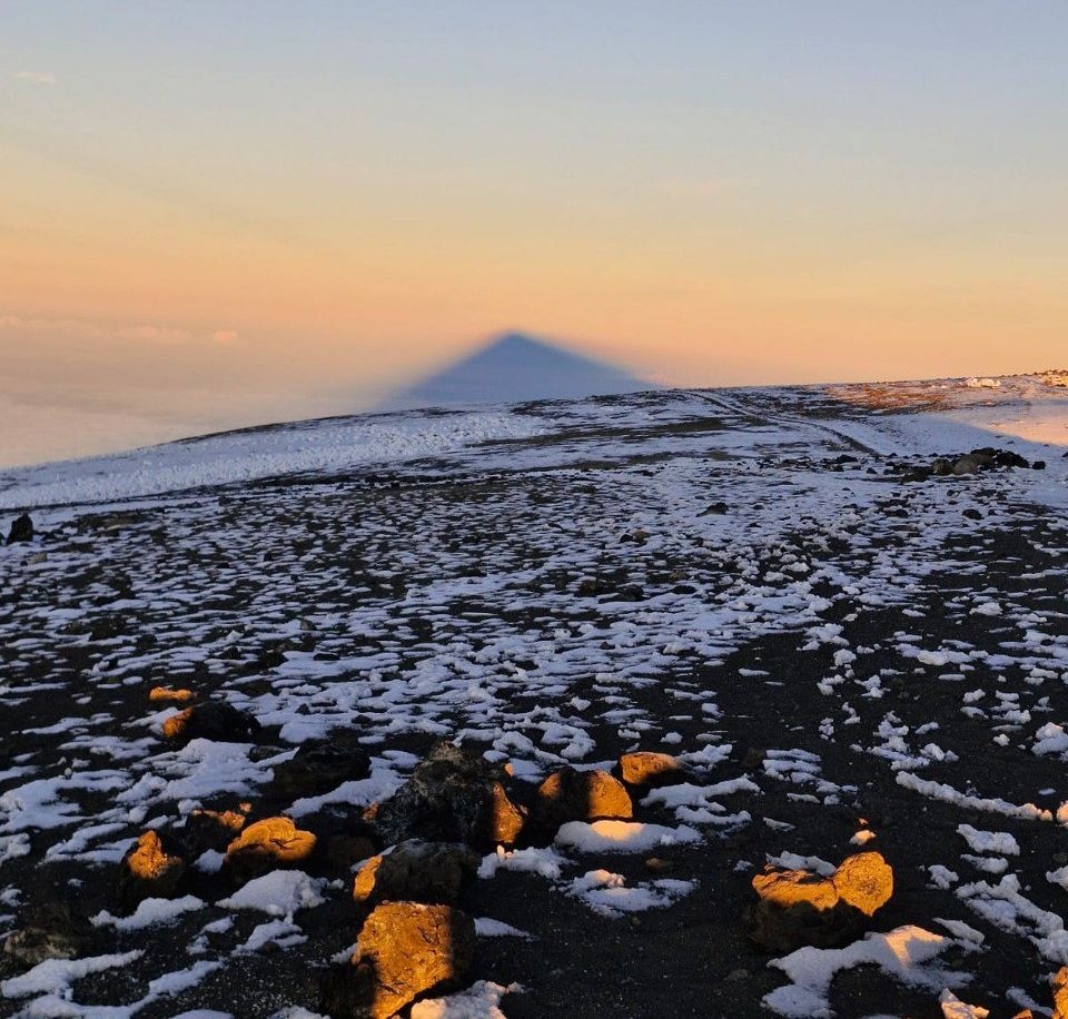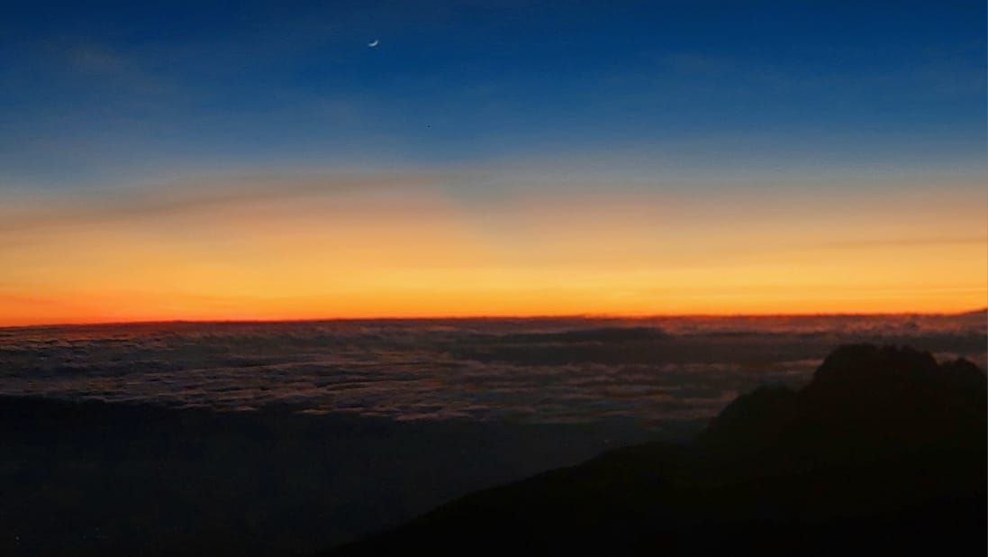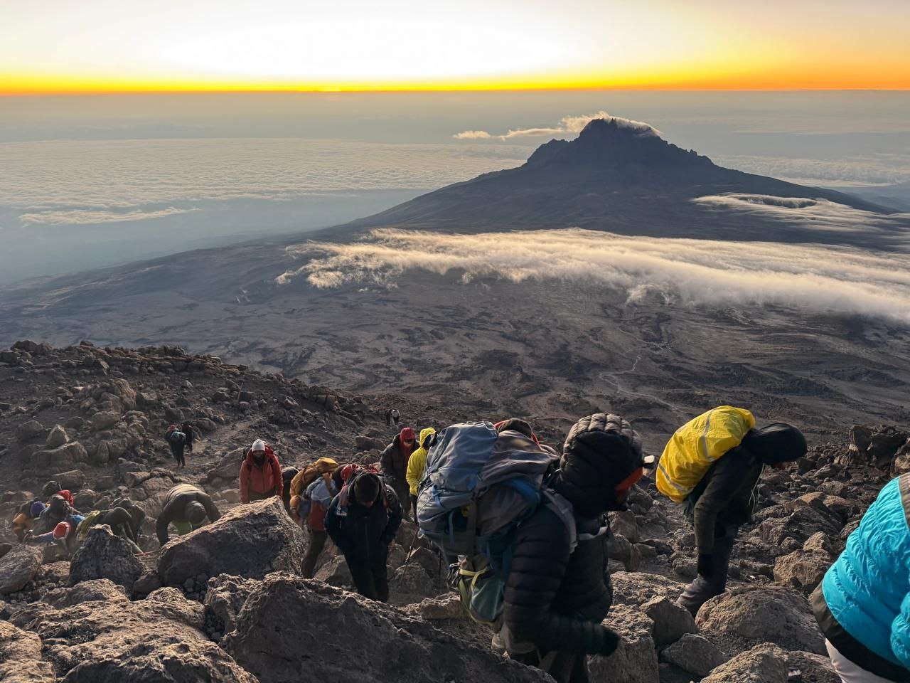Nighttime shots of Kilimanjaro's crater in the light of the full moon, tea, and your favorite songs to help you fight off the drowsiness that rolls in like waves. And then, off you go again. Two more hours of work lie ahead, now at altitude. An hour and a half later, as soon as you pass Stella Point, the magic of sunrise begins. And you see with your own eyes how the valleys of golden Africa are bathed in the rays of the sun. This is something that can't be described in words, videos, or photos; you have to see it with your own eyes!