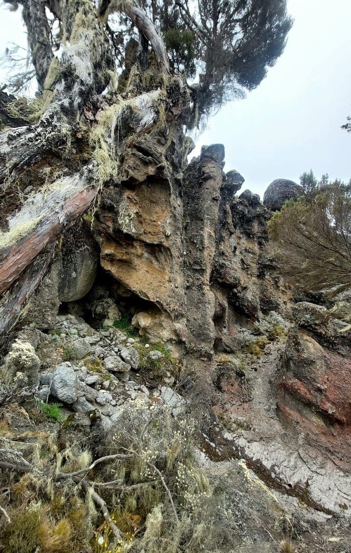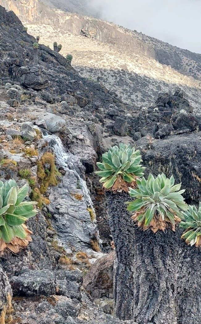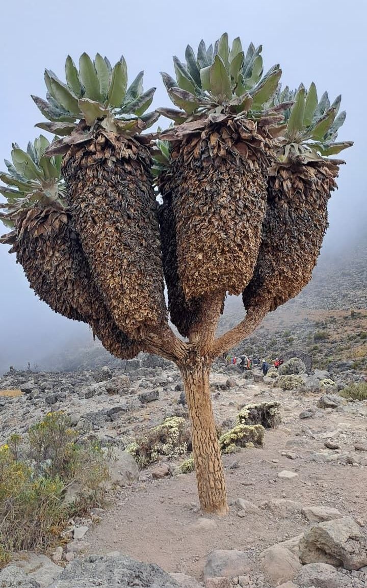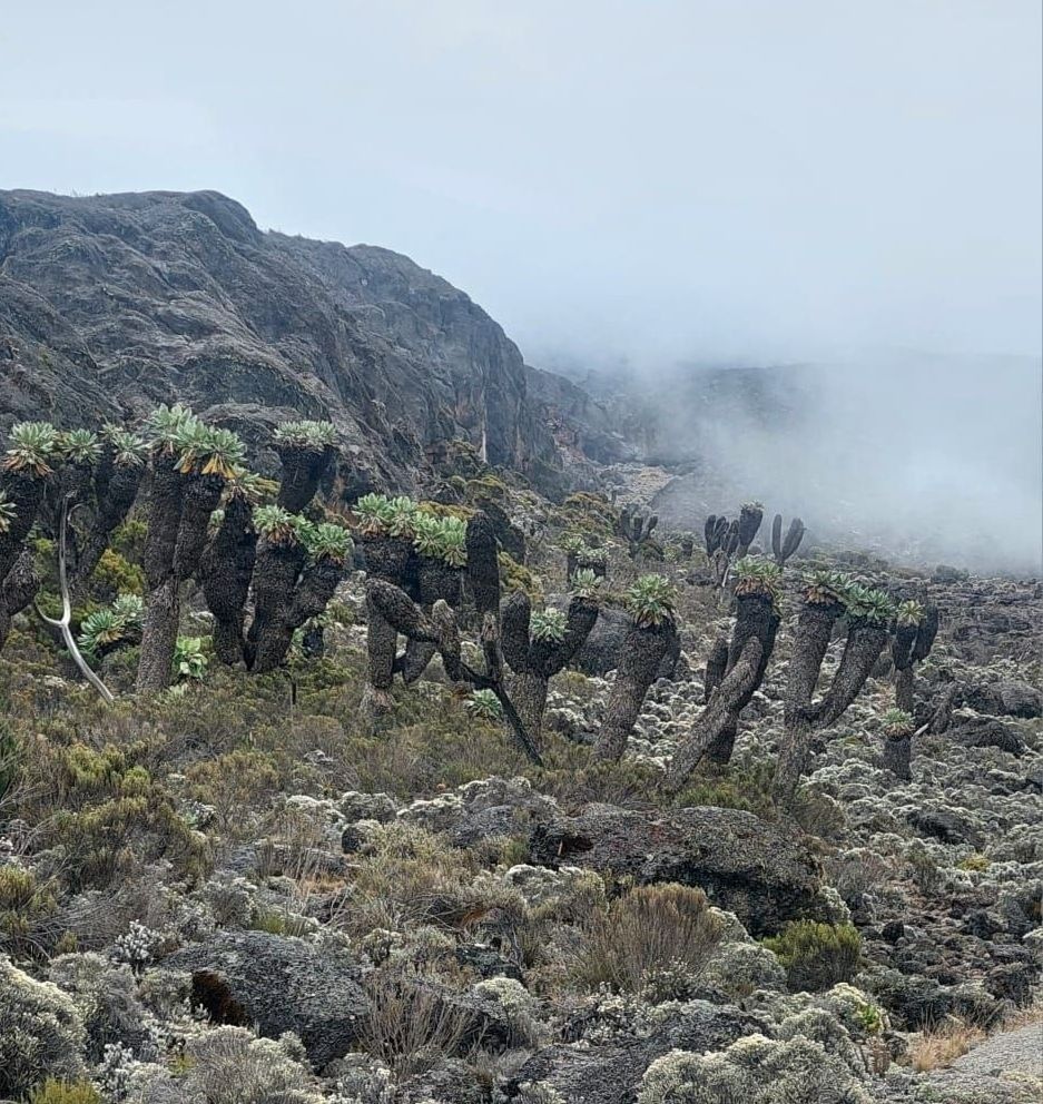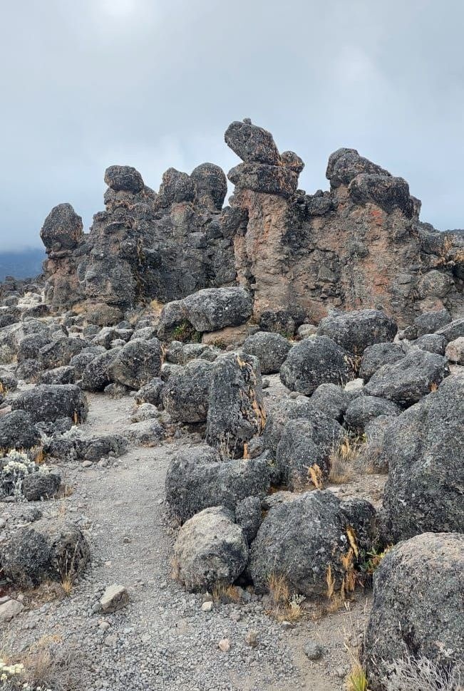 Today we had a very long and eventful day. In the morning, we did exercises, had breakfast, and went out on the trail. Having passed through lava collapses, we reached Lawa Tower - this is a real lava tower, at the foot of which they prepared a delicious lunch for us. We stayed a little for acclimatization at an altitude of 4600 m, and slowly went on, descending down. A real green oasis awaited us ahead: endemic plants of unusual shapes, of various sizes, which surprised and delighted us very much.