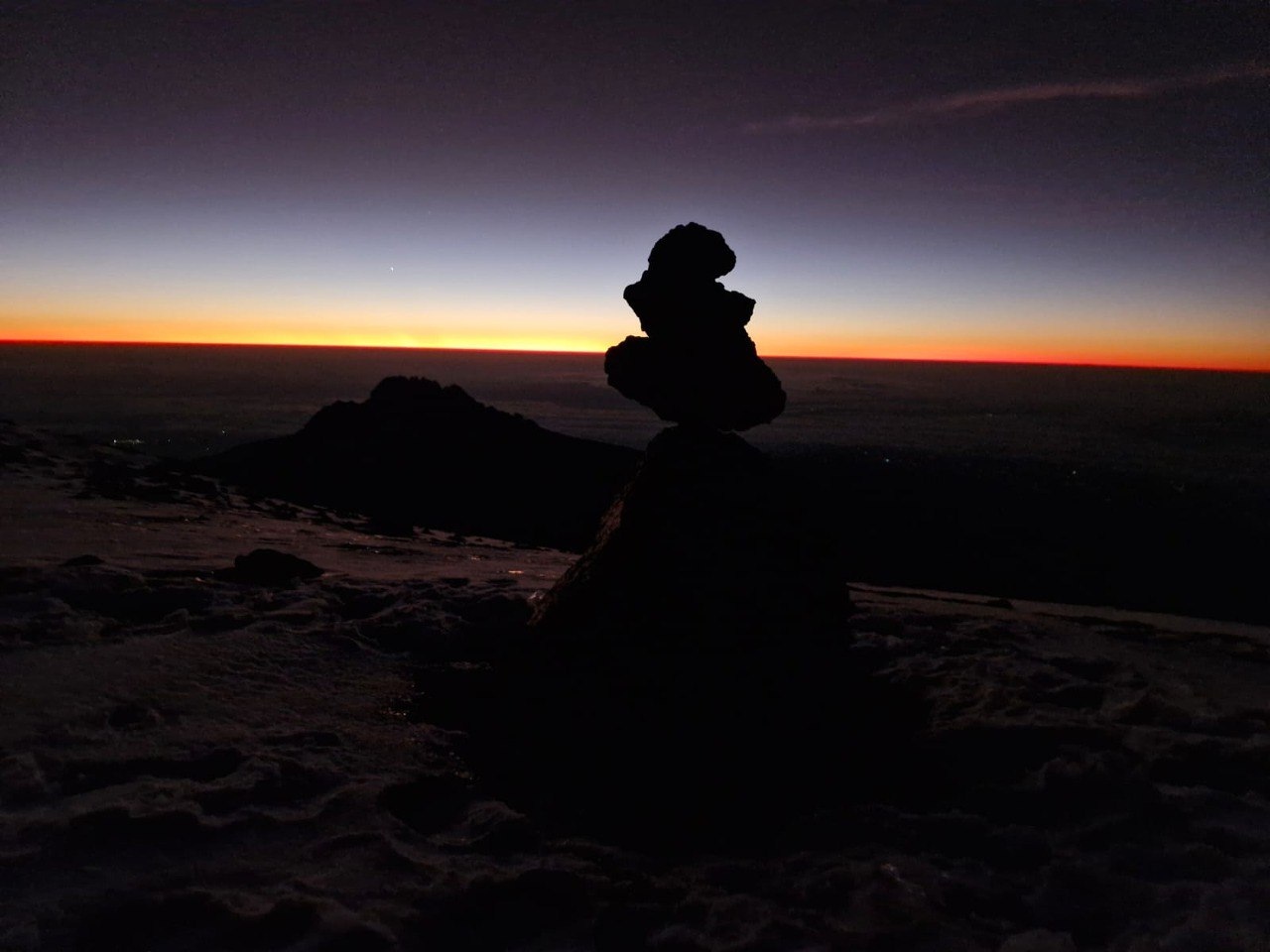 We set out for the summit push at precisely midnight. We walked at a steady, confident, and steady pace, taking our time. We took our first short break at 3:00 AM, rested at 4:00 AM at Gilmansa Point, and then leisurely trudged to the summit, reaching it precisely at 6:00 AM. A blistering gust of wind awaited us there, so after quickly snapping a couple of photos, we descended at 6:15 AM. We had plenty of energy, the sun was warm, and our legs ran naturally down. In the end, the descent took only 1:40.