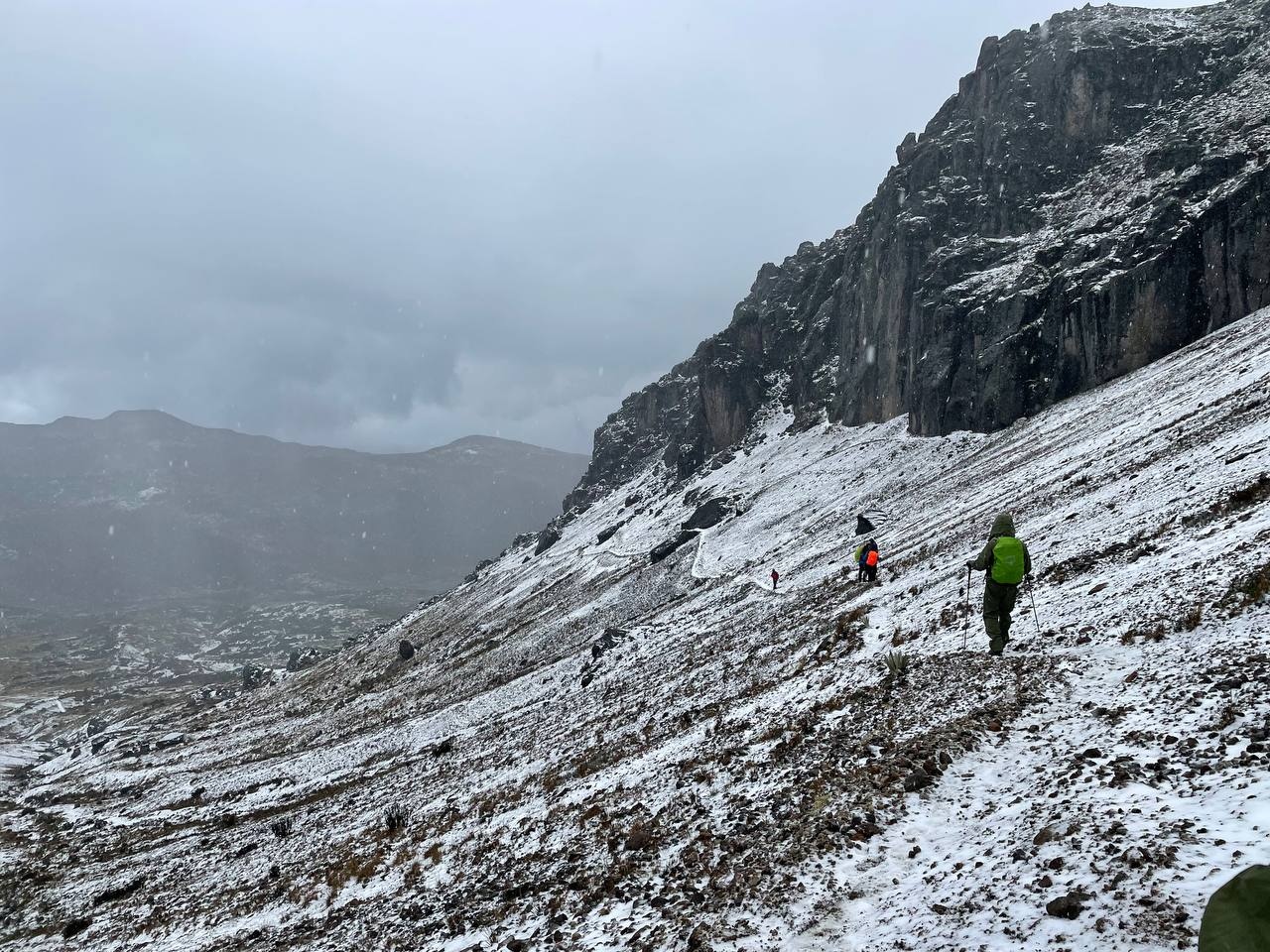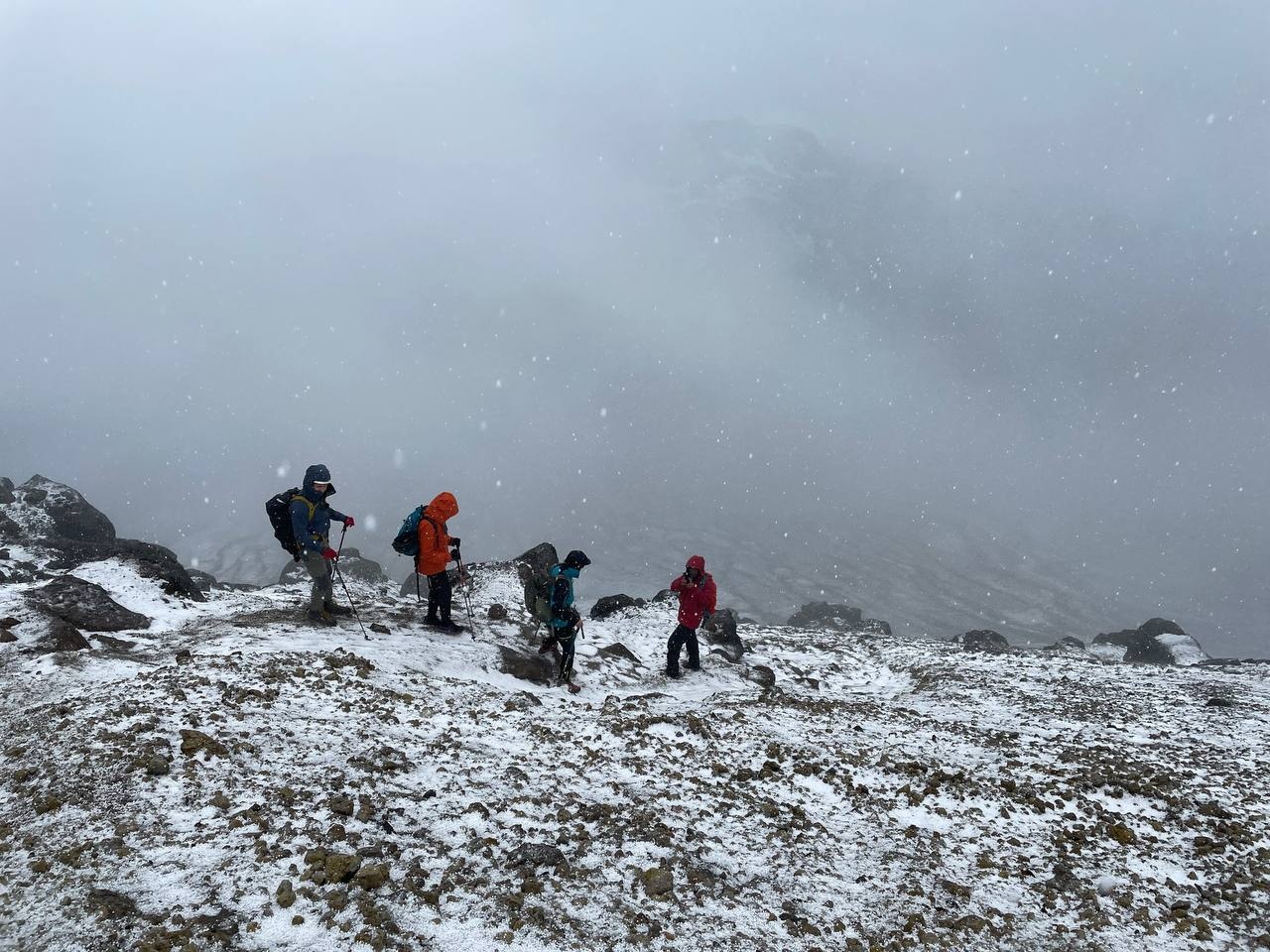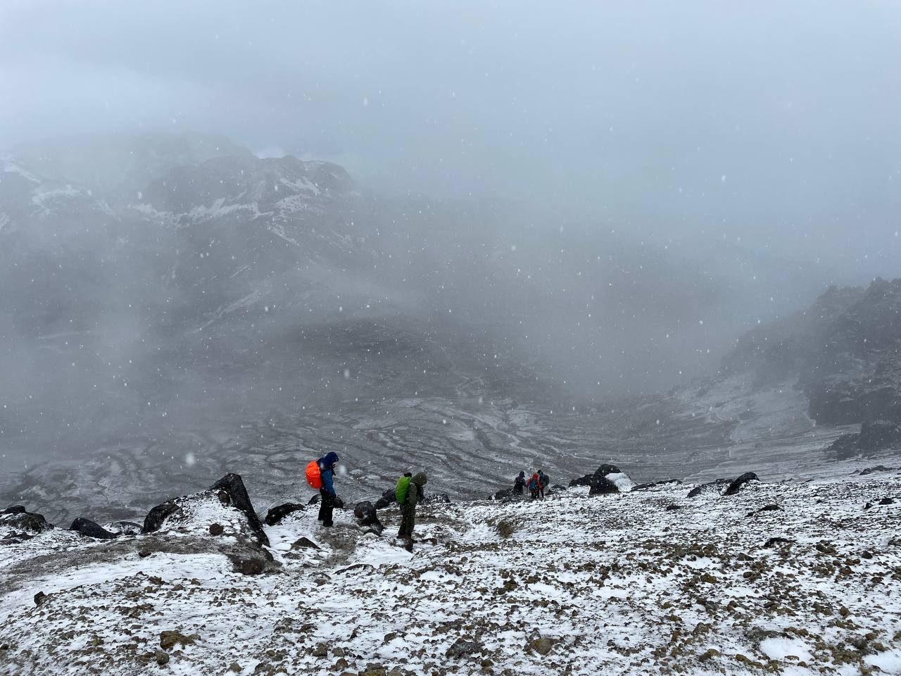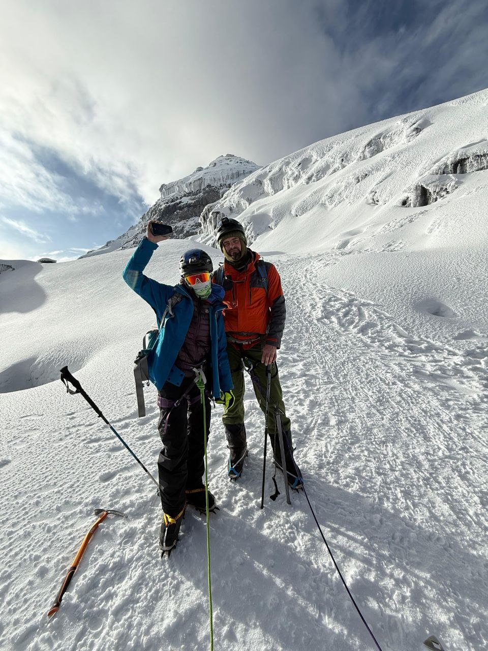 News of the Super Cui Team. We climbed up in a thunderstorm to camp 5350 on the slope of Mount Chimborazo. Here we were waiting for tents in the snow. We were caught in a thunderstorm on the way. Lightning struck the ridge, we threw all our things and lay in the snow for 30 minutes. Then it got better and we continued climbing.