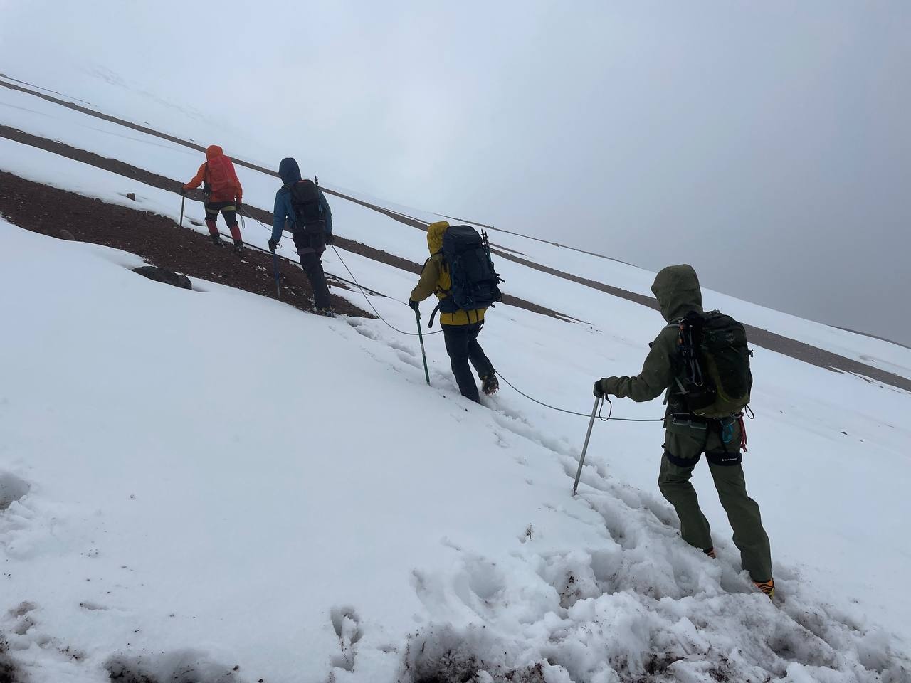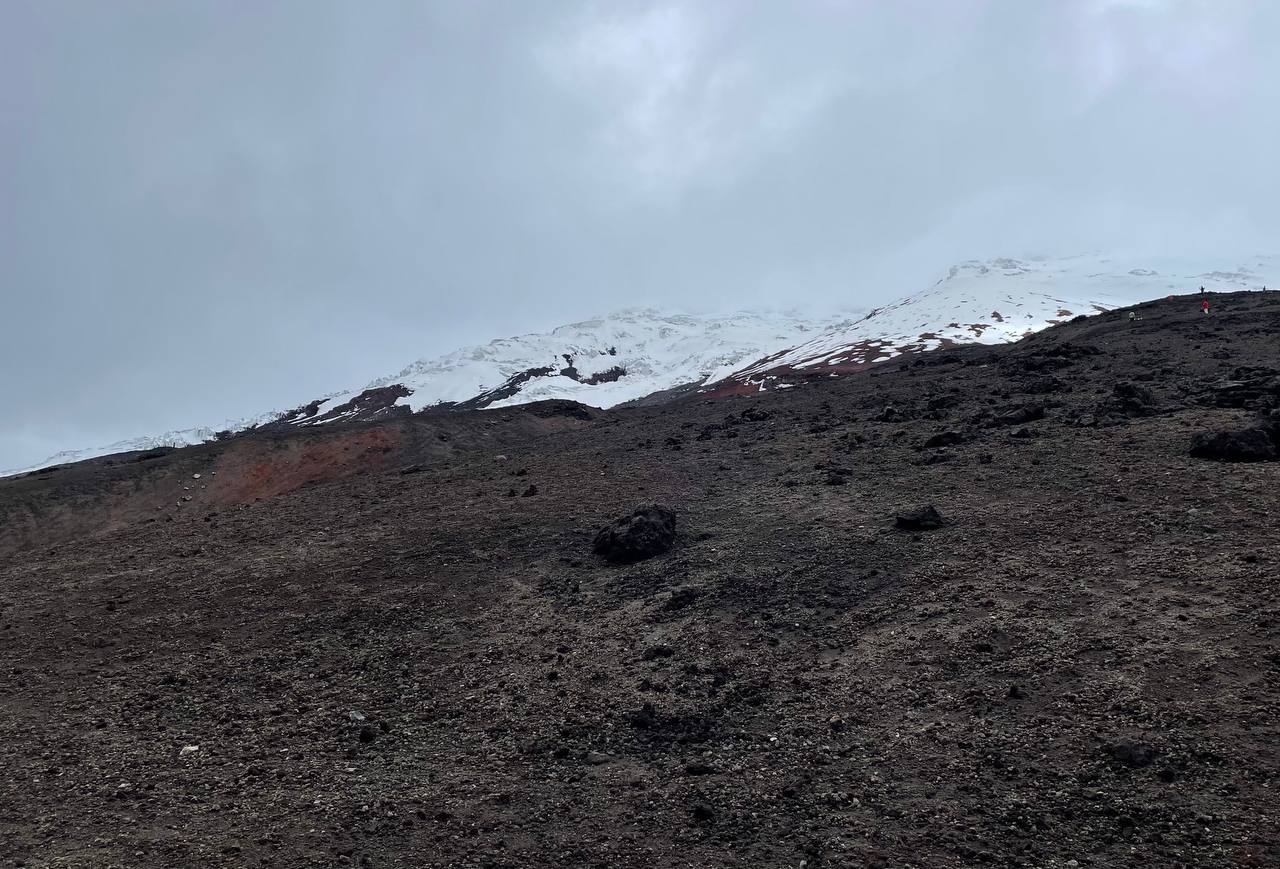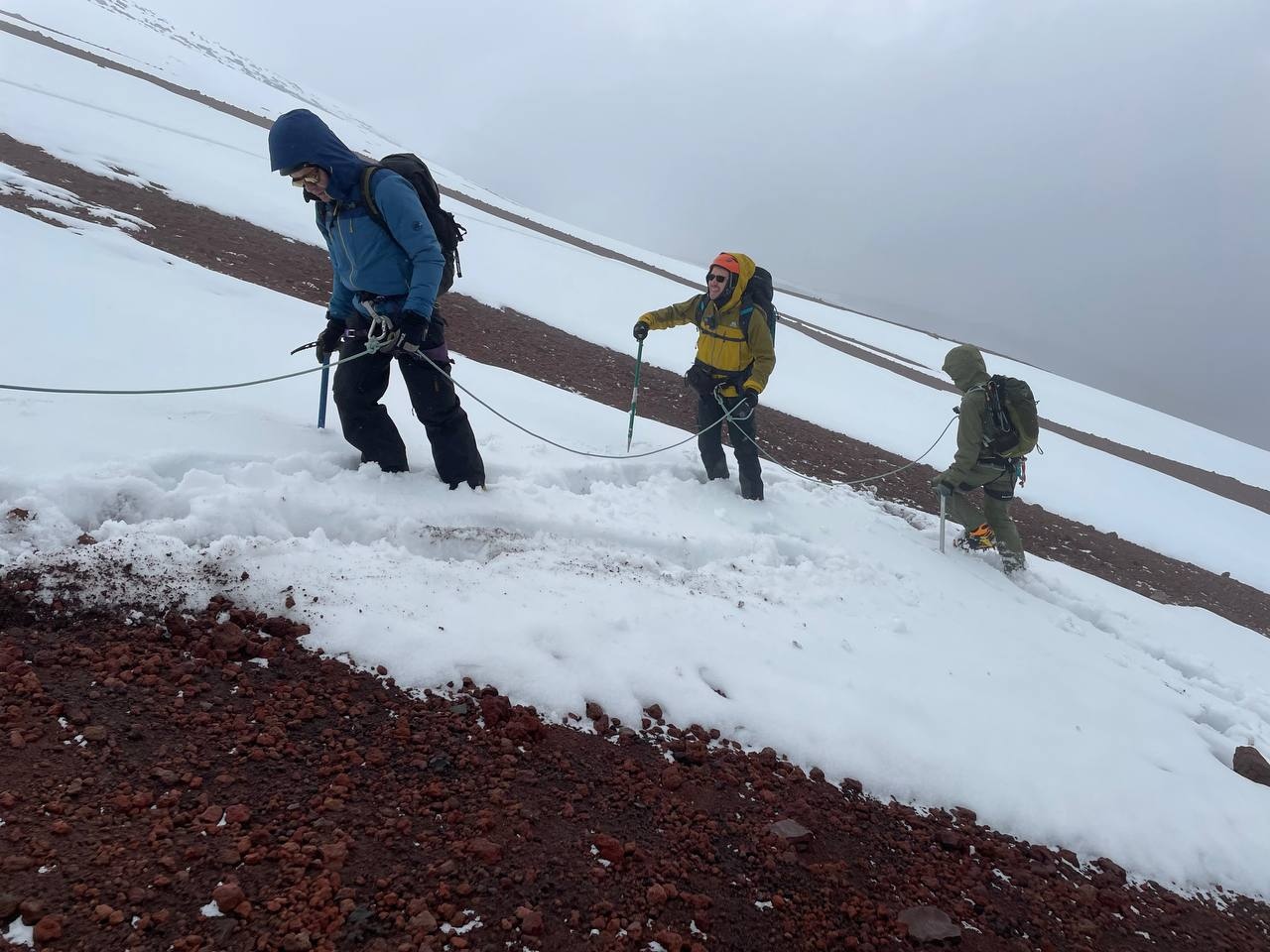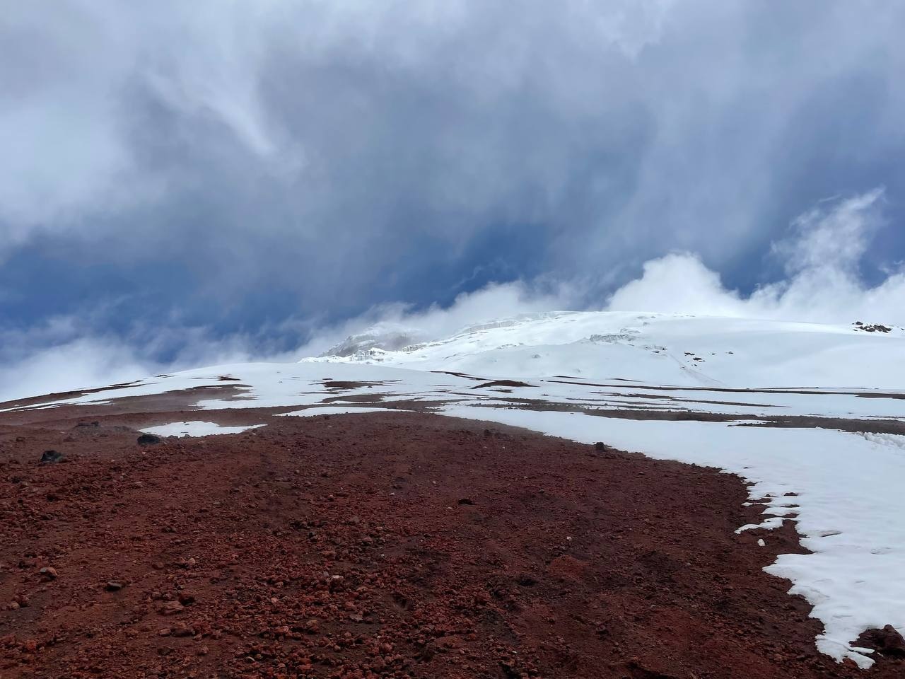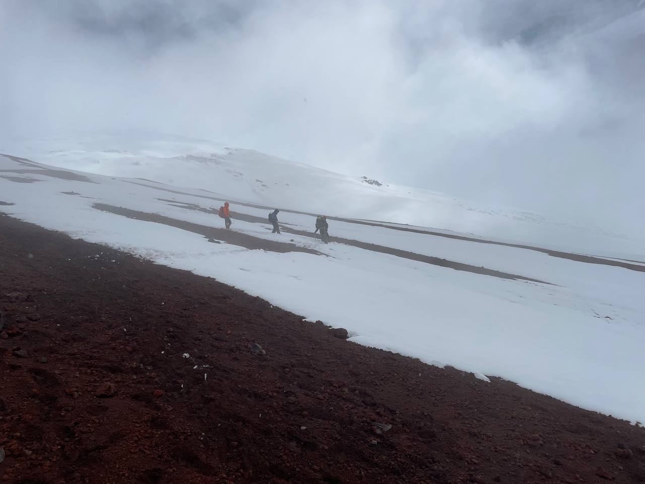 Today, our group had a day of altitude acclimatization on the Cotopaxi Glacier. We reached the mountain slopes and ascended to approximately 5,000 meters. The weather was unfavorable—wind, sleet, and the possibility of a thunderstorm—so we decided to descend earlier than expected.